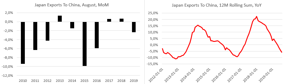 Economia niponă depinde într-o mare măsură de evoluția exporturilor, așadar datele privind comerțul exterior ar putea fi deosebit de importante. Ceea ce am primit mai devreme nu poate fi, în niciun fel, interpretat ca un semnal pozitiv. Mai mult, exporturile japoneze din august s-au redus cu 8,2% YoY, iar importurile au scăzut și acestea, cu 12% YoY. Mai mult decât atât, cifrele devin tot mai îngrijorătoare, atunci când analizăm exporturile către China, deoarece acestea au scăzut cu 12,1% YoY, a doua cea mai slabă evoluție din ultimii trei ani. Dacă ne uităm doar la august, scăderea de 2,3% a fost cea mai mare din 2016, după cum se poate observa în graficul de mai jos. Deși piața se aștepta la o evoluție descendentă (consensul indica chiar și o scădere de 10% YoY), evoluția ar putea ridica semne de întrebare, deoarece Japonia a anunțat o majorare a taxei pe valoare adăugată de la 1 octombrie. Ca rezultat, ne așteptăm ca japonezii să grăbească achizițiile de bunuri din import în septembrie, ceea ce ar trebui să se reflecte atât în datele privind vânzările cu amănuntul, cât și în ceea ce privește evoluția importurilor. Perspectivele economiei nipone vor depinde de felul în care autoritățile japoneze vor gestiona efectele adverse ale majorării taxei menționate. Luând în considerare acest aspect, considerăm că nu se poate exclude o recesiune în ultimul trimestru.