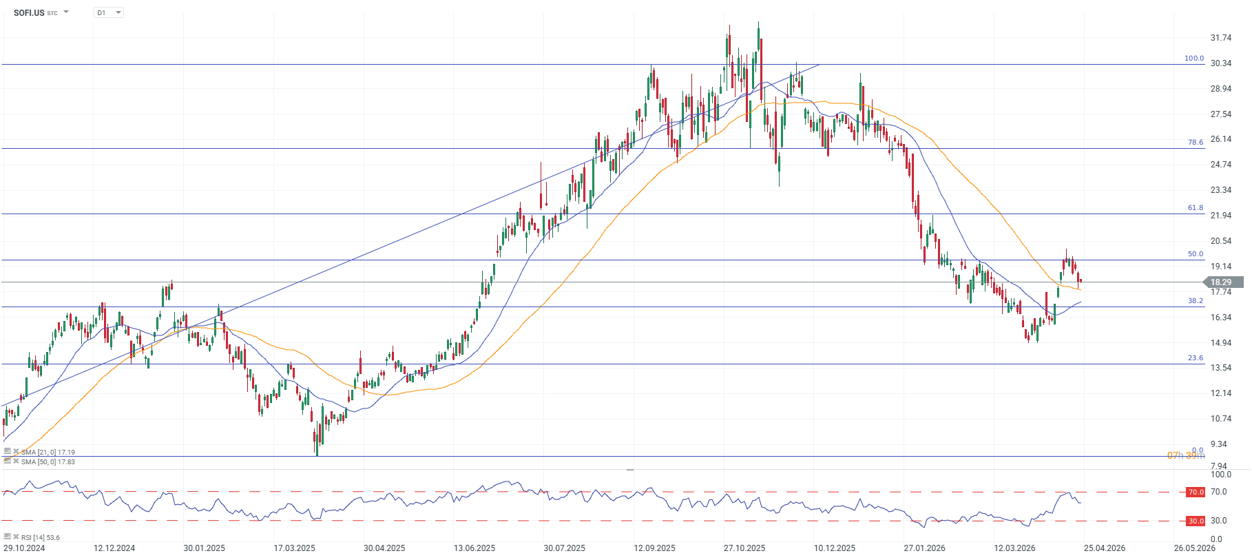 Performanța acțiunilor pe un an: Utilizând prețul actual furnizat de 18,33 USD (la data de 23 aprilie 2026) și prețul de închidere al pieței din 23 aprilie 2025 (aproximativ 11,74 USD), randamentul total al prețului SOFI pe un an este de ≈ +49%