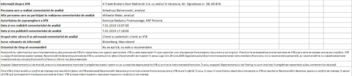 "Acest material este o comunicare de marketing în sensul articolului 24 alineatul (3) din Directiva 2014/65 / UE a Parlamentului European și a Consiliului din 15 mai 2014 privind piețele de instrumente financiare, și de modificare a Directivei 2002/92 / CE și a Directivei 2011 / 61 / UE (MiFID II). Comunicarea de marketing nu este o recomandare de investiții sau o recomandare de informații sau o recomandare care sugerează o strategie de investiții în sensul Regulamentului (UE) nr. 596/2014 al Parlamentului European și al Consiliului din 16 aprilie 2014 privind abuzul de piață ( reglementarea abuzului de piață) și de abrogare a Directivei 2003/6 / CE a Parlamentului European și a Consiliului și a Directivelor Comisiei 2003/124 / CE, 2003/125 / CE și 2004/72 / CE și a Regulamentului delegat (UE) 2016/958 al Comisiei din 9 596/2014 al Parlamentului European și al Consiliului în ceea ce privește standardele tehnice de reglementare pentru aranjamentele tehnice pentru prezentarea obiectivă a recomandărilor de investiții sau a altor informații care sugerează strategii de investiții și pentru dezvăluirea de interese particulare sau indicații de conflicte de interese sau orice alte sfaturi, inclusiv în domeniul consultanței în materie de investiții, în sensul Legii privind tranzacționarea cu instrumente financiare din 29 iulie 2005 (de ex. Journal of Laws 2019, articolul 875, astfel cum a fost modificat). Comunicarea de marketing este pregătită cu cea mai mare diligență, obiectivitate, prezintă faptele cunoscute autorului la data pregătirii și este lipsită de orice elemente de evaluare. Comunicarea de marketing este pregătită fără a lua în considerare nevoile clientului, situația sa financiară individuală și nu prezintă nicio strategie de investiții în niciun fel. Comunicarea de marketing nu constituie o ofertă de vânzare, oferire, abonament, invitație la cumpărare, reclamă sau promovare a oricărui instrument financiar. XTB SA nu este responsabilă pentru acțiunile sau omisiunile niciunui client, în special pentru achiziționarea sau cedarea instrumente, întreprinse pe baza informațiilor conținute în această comunicare de marketing. XTB SA nu va accepta răspunderea pentru nicio pierdere sau daună, inclusiv, fără limitare, orice pierdere care poate apărea direct sau indirect, efectuată pe baza informațiilor conținute în această comunicare de marketing. În cazul în care comunicarea de marketing conține informații despre orice rezultat cu privire la instrumentele financiare indicate în acestea, acestea nu constituie nicio garanție sau prognoză cu privire la rezultatele viitoare. Performanțele anterioare nu indică neapărat rezultatele viitoare și orice persoană care acționează pe baza acestor informații o face pe propriul risc. Acest material nu este emis pentru a influenta deciziile de tranzacționare ale niciunei persoane. Informațiile cuprinse în cadrul acestui material nu sunt prezentate pentru a fi aplicate, copiate sau testate în cadrul tranzacțiilor dumneavoastră. Informațiile cuprinse în cadrul acestui material sunt emise în baza experienței proprii a emitentului și nu reprezintă o recomandare individuală, nu vizează atingerea anumitor obiective, randamente financiare și nu se adresează nevoilor niciunei persoane anume care ar primi-o. Premisele acestui material nu au în vedere situația și persoana dumneavoastră deci nu recomandăm utilizarea acestor informații sub orice formă. Utilizarea informațiilor cuprinse în cadrul acestui material în orice modalitate se face pe propria dumneavoastră răspundere. Acest material este emis de către un analist pentru care își asumă răspunderea XTB SA, persoană juridică autorizată de KNF – Autoritatea de Supraveghere Financiara din Polonia."