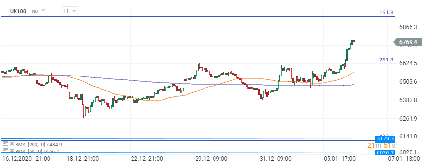 Indicele FTSE 100 a crescut cu 5,7% în primele trei sesiuni din 2021, fiind în drum spre depășirea recordului anterior stabilit în 2009. De data aceasta, cotația beneficiază de un impuls din partea investitorilor care se reorientează către sectoare sensibile la evoluția economiei. Această tendință a apărut pe măsură ce democrații din SUA se apropie de obținerea controlului în Senat. Performanța dezamăgitoare a pieței britanice a fost o urmare a faptului că s-a confruntat cu mai mulți factori de risc. Pe lângă contextul general pesimist determinat de pandemia globală, subiectul Brexit reprezenta o problemă serioasă pentru perspectivele economice ale țării. Încheierea unui acord a pus capăt unei perioade îndelungate de incertitudine pentru sectoarele ciclice și a favorizat apariția acestui impuls ascendent ”de ușurare” (relief rally).