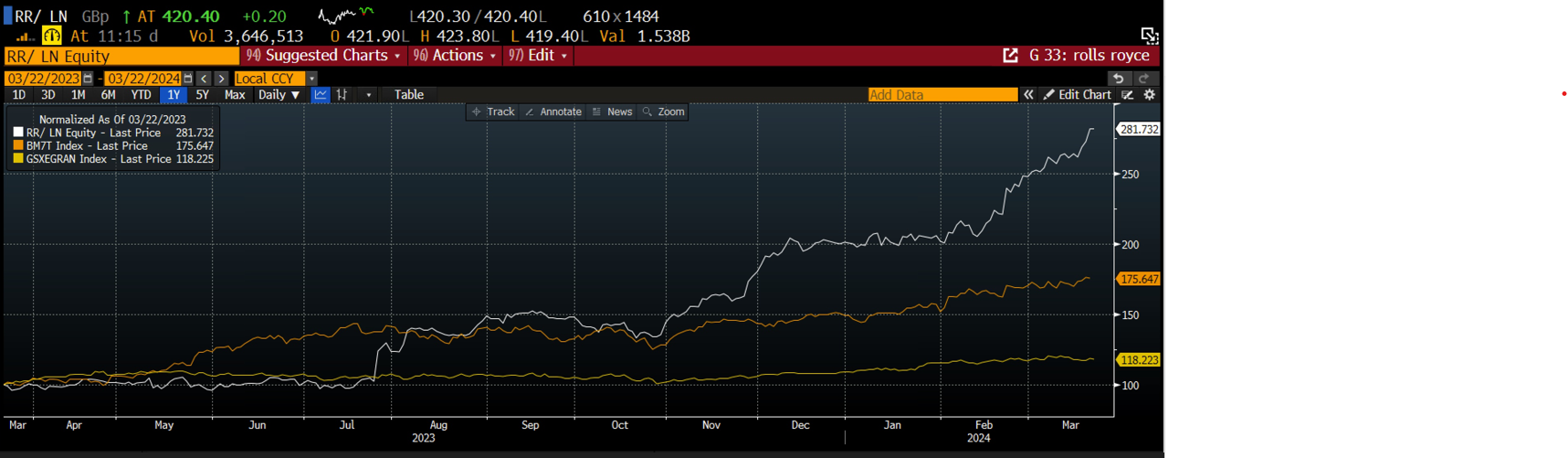 Graficul de mai jos prezintă Rolls Royce (alb), cele 7 acțiuni tehnologice importante din SUA (linia portocalie) și granzii europeni (linia galbenă). Acest grafic a fost normalizat pentru a arăta modul în care acestea evoluează împreună în mod relativ. După cum puteți vedea, Rolls Royce a supraperformat în raport cu restul. Rolls Royce a pornit de la o bază mai mică, dar un set puternic de rezultate pentru 2023, o primire pozitivă a noului CEO și o evaluare ieftină au ajutat Rolls Royce, iar această acțiune este una dintre cele mai performante în acest moment.