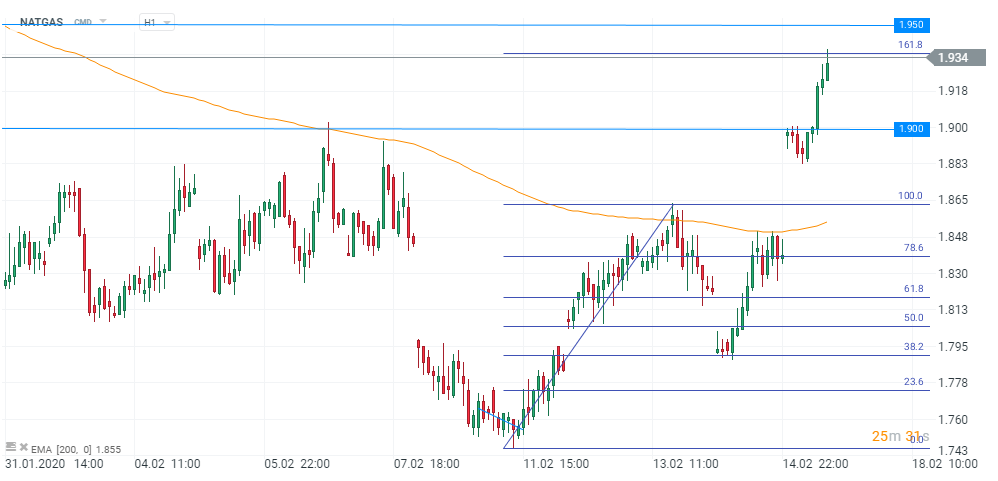 Din punct de vedere tehnic, cotația a încheiat săptămâna trecută într-un punct critic: sub zona cheie de rezistență sub forma mediei mobile exponențiale de 200 de perioade (aproximativ 1,85). Totuși, deschiderea de astăzi a adus un gap ascendent considerabil care a împins prețul către nivelul de rezistență de la 1,900 care a marcat întreruperea unei secvențe de creștere pe 6 februarie. La momentul scrierii, cumpărătorii încearcă să depășească obstacolul de la 1,935 care este marcat de o retragere exterioară Fibonacci de 161,8% din secvența ascendentă de la jumătatea săptămânii anterioare. În eventualitatea unei confirmări, am putea asista la o extindere a impulsului către zona maximelor locale de la 1,950. Totuși, perspectiva pozitivă nu este atât de clară întrucât în intervalul 22 - 26 februarie este așteptată o îmbunătățire a temperaturii, ceea ce ar putea ”tăia” o parte din elanul cumpărătorilor.