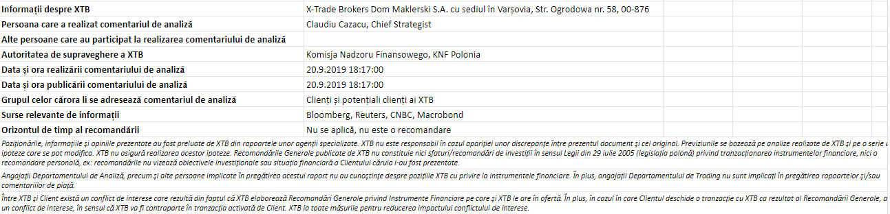 "Acest material este o comunicare de marketing în sensul articolului 24 alineatul (3) din Directiva 2014/65 / UE a Parlamentului European și a Consiliului din 15 mai 2014 privind piețele de instrumente financiare, și de modificare a Directivei 2002/92 / CE și a Directivei 2011 / 61 / UE (MiFID II). Comunicarea de marketing nu este o recomandare de investiții sau o recomandare de informații sau o recomandare care sugerează o strategie de investiții în sensul Regulamentului (UE) nr. 596/2014 al Parlamentului European și al Consiliului din 16 aprilie 2014 privind abuzul de piață ( reglementarea abuzului de piață) și de abrogare a Directivei 2003/6 / CE a Parlamentului European și a Consiliului și a Directivelor Comisiei 2003/124 / CE, 2003/125 / CE și 2004/72 / CE și a Regulamentului delegat (UE) 2016/958 al Comisiei din 9 596/2014 al Parlamentului European și al Consiliului în ceea ce privește standardele tehnice de reglementare pentru aranjamentele tehnice pentru prezentarea obiectivă a recomandărilor de investiții sau a altor informații care sugerează strategii de investiții și pentru dezvăluirea de interese particulare sau indicații de conflicte de interese sau orice alte sfaturi, inclusiv în domeniul consultanței în materie de investiții, în sensul Legii privind tranzacționarea cu instrumente financiare din 29 iulie 2005 (de ex. Journal of Laws 2019, articolul 875, astfel cum a fost modificat). Comunicarea de marketing este pregătită cu cea mai mare diligență, obiectivitate, prezintă faptele cunoscute autorului la data pregătirii și este lipsită de orice elemente de evaluare. Comunicarea de marketing este pregătită fără a lua în considerare nevoile clientului, situația sa financiară individuală și nu prezintă nicio strategie de investiții în niciun fel. Comunicarea de marketing nu constituie o ofertă de vânzare, oferire, abonament, invitație la cumpărare, reclamă sau promovare a oricărui instrument financiar. XTB SA nu este responsabilă pentru acțiunile sau omisiunile niciunui client, în special pentru achiziționarea sau cedarea instrumente, întreprinse pe baza informațiilor conținute în această comunicare de marketing. XTB SA nu va accepta răspunderea pentru nicio pierdere sau daună, inclusiv, fără limitare, orice pierdere care poate apărea direct sau indirect, efectuată pe baza informațiilor conținute în această comunicare de marketing. În cazul în care comunicarea de marketing conține informații despre orice rezultat cu privire la instrumentele financiare indicate în acestea, acestea nu constituie nicio garanție sau prognoză cu privire la rezultatele viitoare. Performanțele anterioare nu indică neapărat rezultatele viitoare și orice persoană care acționează pe baza acestor informații o face pe propriul risc. Acest material nu este emis pentru a influenta deciziile de tranzacționare ale niciunei persoane. Informațiile cuprinse în cadrul acestui material nu sunt prezentate pentru a fi aplicate, copiate sau testate în cadrul tranzacțiilor dumneavoastră. Informațiile cuprinse în cadrul acestui material sunt emise în baza experienței proprii a emitentului și nu reprezintă o recomandare individuală, nu vizează atingerea anumitor obiective, randamente financiare și nu se adresează nevoilor niciunei persoane anume care ar primi-o. Premisele acestui material nu au în vedere situația și persoana dumneavoastră deci nu recomandăm utilizarea acestor informații sub orice formă. Utilizarea informațiilor cuprinse în cadrul acestui material în orice modalitate se face pe propria dumneavoastră răspundere. Acest material este emis de către un analist pentru care își asumă răspunderea XTB SA, persoană juridică autorizată de KNF – Autoritatea de Supraveghere Financiara din Polonia."