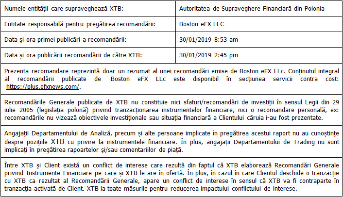 "Acest material este o comunicare de marketing în sensul articolului 24 alineatul (3) din Directiva 2014/65 / UE a Parlamentului European și a Consiliului din 15 mai 2014 privind piețele de instrumente financiare, și de modificare a Directivei 2002/92 / CE și a Directivei 2011 / 61 / UE (MiFID II). Comunicarea de marketing nu este o recomandare de investiții sau o recomandare de informații sau o recomandare care sugerează o strategie de investiții în sensul Regulamentului (UE) nr. 596/2014 al Parlamentului European și al Consiliului din 16 aprilie 2014 privind abuzul de piață ( reglementarea abuzului de piață) și de abrogare a Directivei 2003/6 / CE a Parlamentului European și a Consiliului și a Directivelor Comisiei 2003/124 / CE, 2003/125 / CE și 2004/72 / CE și a Regulamentului delegat (UE) 2016/958 al Comisiei din 9 596/2014 al Parlamentului European și al Consiliului în ceea ce privește standardele tehnice de reglementare pentru aranjamentele tehnice pentru prezentarea obiectivă a recomandărilor de investiții sau a altor informații care sugerează strategii de investiții și pentru dezvăluirea de interese particulare sau indicații de conflicte de interese sau orice alte sfaturi, inclusiv în domeniul consultanței în materie de investiții, în sensul Legii privind tranzacționarea cu instrumente financiare din 29 iulie 2005 (de ex. Journal of Laws 2019, articolul 875, astfel cum a fost modificat). Comunicarea de marketing este pregătită cu cea mai mare diligență, obiectivitate, prezintă faptele cunoscute autorului la data pregătirii și este lipsită de orice elemente de evaluare. Comunicarea de marketing este pregătită fără a lua în considerare nevoile clientului, situația sa financiară individuală și nu prezintă nicio strategie de investiții în niciun fel. Comunicarea de marketing nu constituie o ofertă de vânzare, oferire, abonament, invitație la cumpărare, reclamă sau promovare a oricărui instrument financiar. XTB SA nu este responsabilă pentru acțiunile sau omisiunile niciunui client, în special pentru achiziționarea sau cedarea instrumente, întreprinse pe baza informațiilor conținute în această comunicare de marketing. XTB SA nu va accepta răspunderea pentru nicio pierdere sau daună, inclusiv, fără limitare, orice pierdere care poate apărea direct sau indirect, efectuată pe baza informațiilor conținute în această comunicare de marketing. În cazul în care comunicarea de marketing conține informații despre orice rezultat cu privire la instrumentele financiare indicate în acestea, acestea nu constituie nicio garanție sau prognoză cu privire la rezultatele viitoare. Performanțele anterioare nu indică neapărat rezultatele viitoare și orice persoană care acționează pe baza acestor informații o face pe propriul risc. Acest material nu este emis pentru a influenta deciziile de tranzacționare ale niciunei persoane. Informațiile cuprinse în cadrul acestui material nu sunt prezentate pentru a fi aplicate, copiate sau testate în cadrul tranzacțiilor dumneavoastră. Informațiile cuprinse în cadrul acestui material sunt emise în baza experienței proprii a emitentului și nu reprezintă o recomandare individuală, nu vizează atingerea anumitor obiective, randamente financiare și nu se adresează nevoilor niciunei persoane anume care ar primi-o. Premisele acestui material nu au în vedere situația și persoana dumneavoastră deci nu recomandăm utilizarea acestor informații sub orice formă. Utilizarea informațiilor cuprinse în cadrul acestui material în orice modalitate se face pe propria dumneavoastră răspundere. Acest material este emis de către un analist pentru care își asumă răspunderea XTB SA, persoană juridică autorizată de KNF – Autoritatea de Supraveghere Financiara din Polonia."
