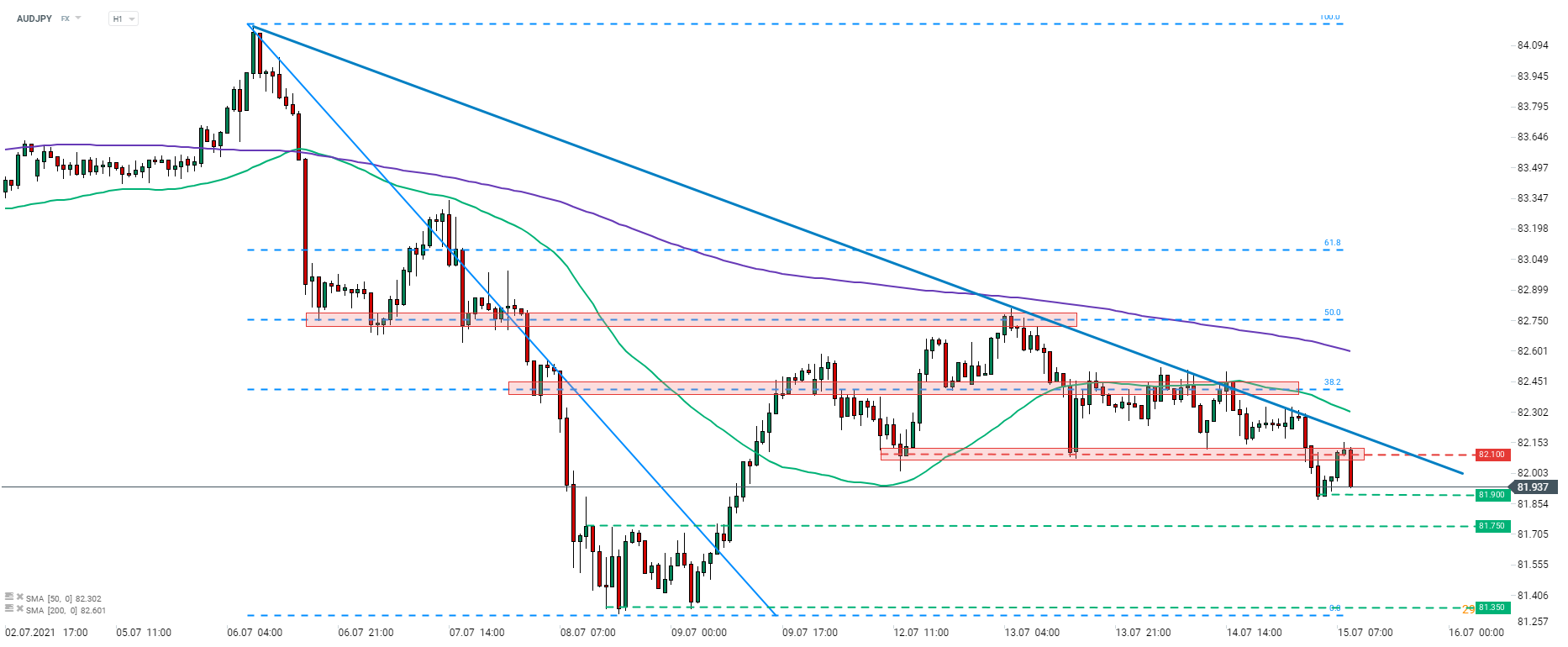 AUDJPY a ricoșat din pragul de 81,90 în timpul nopții. Cu toate acestea, cumpărătorii nu au reușit să spargă deasupra zonei de rezistență în jurul zonei 82,10 și a fost lansată o mișcare puternică în jos. Structura tendinței descendente pare a fi intactă și în cazul în care ar avea loc o spargere sub minimul local menționat anterior la 81,90, declinurile ar putea accelera. Într-un astfel de scenariu, următoarele două niveluri de suport de urmărit pot fi găsite la 81,75 și 81,35.