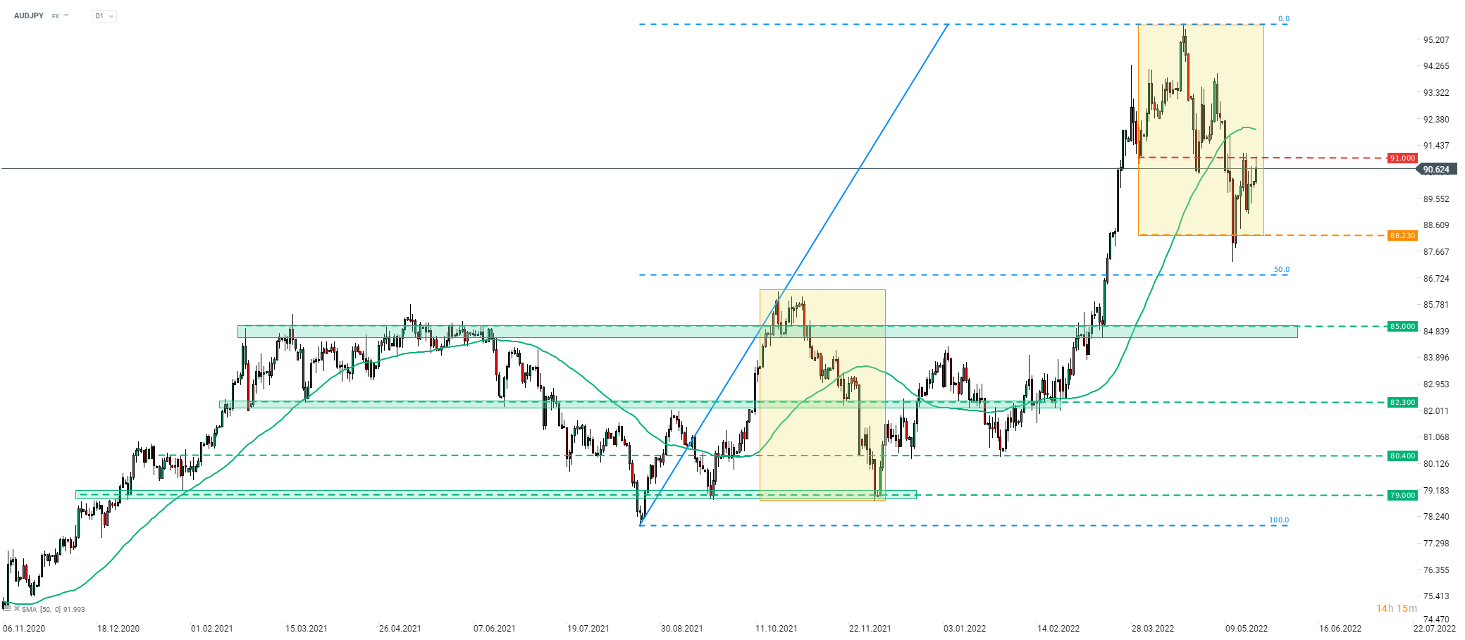 Dolarul australian nu este determinat doar de rezultatele alegerilor de astăzi ci și de o atitudine generală privind riscul care poate fi observată pe piețele globale. Joe Biden a sugerat încă o dată că ia în considerare eliminarea unora dintre tarifele din era Trump impuse Chinei. În timp ce acest lucru oferă suport pentru AUD, este, de asemenea, o pierdere pentru JPY. Aruncând o privire asupra graficului AUDJPY pe intervalul D1, putem vedea că perechea s-a apropiat din nou de maximul local recent în zona 91,00 astăzi, dar nu a reușit să depășească până acum. Imaginea de ansamblu, totuși, arată în continuare optimistă - perechea continuă să își revină în urma testării și apărării cu succes a limitei inferioare a structurii Overbalance.