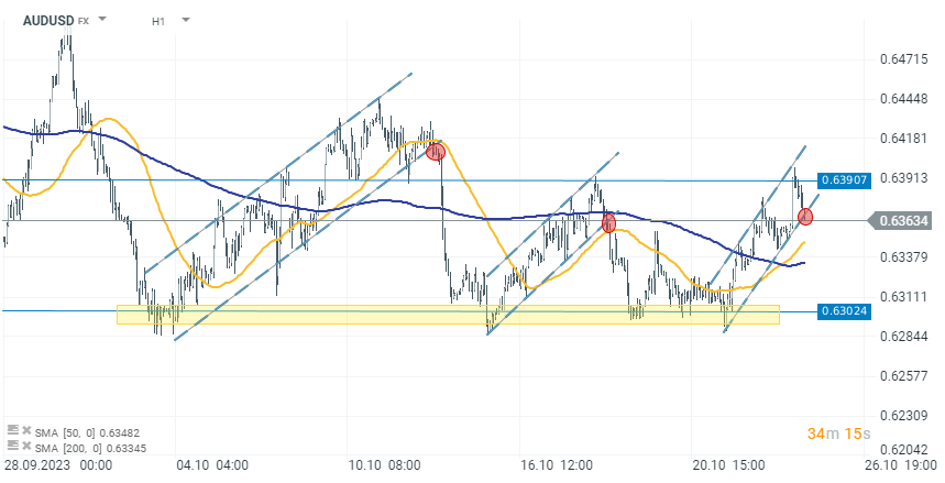 Privind graficul din perspectiva analizei tehnice, observăm o întărire semnificativă a dolarului australian ca urmare a publicării CPI și a declarațiilor mai hawkish ale RBA. În ultimele două zile, AUDUSD a fost cuprinsă în canalul ascendent, iar în prezent, linia inferioară a acestei limite este testată după o slăbire a câștigurilor în urma publicării CPI. Cu toate acestea, acest model și slăbiciunea AUDUSD a dus deja de două ori la ruperea sub această linie, cu o scădere ulterioară până la nivelul de 0,63. Dacă și de această dată vom asista la o depășire a limitei inferioare a mișcării, ne putem aștepta la o reacție similară.