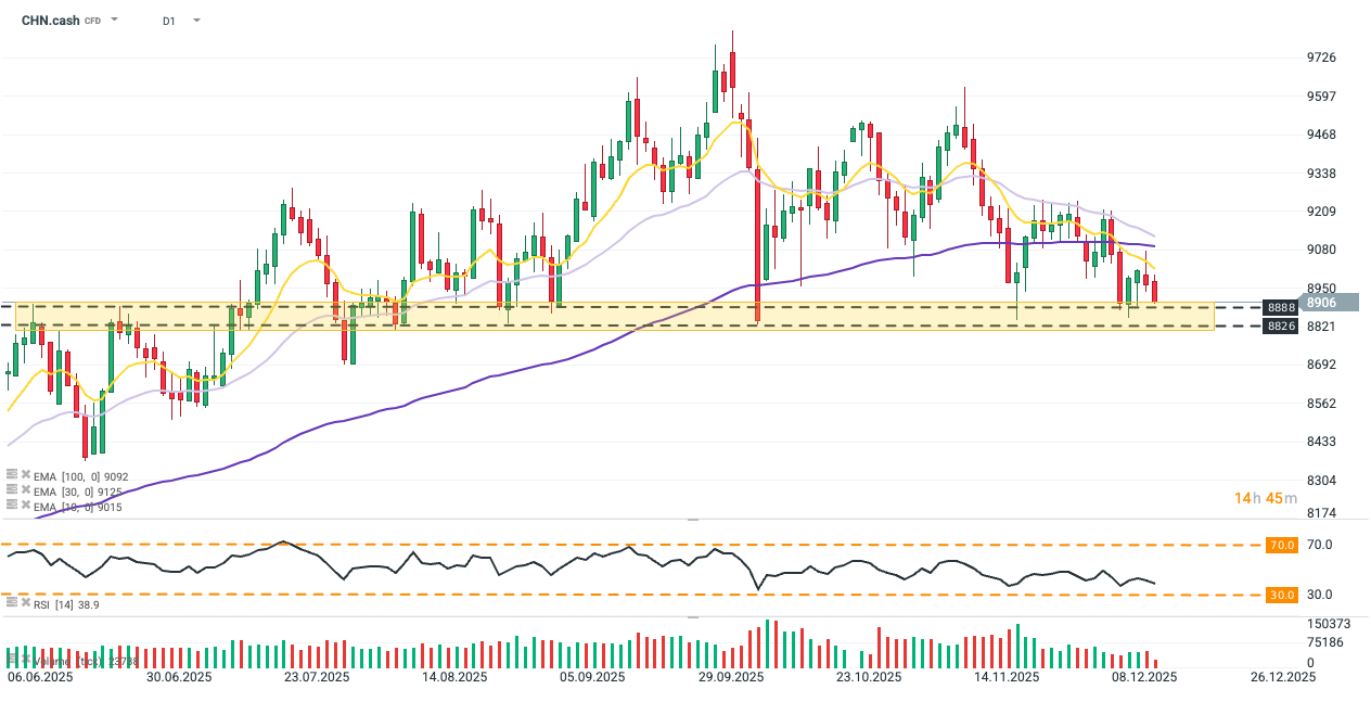 CHN.cash se tranzacționează în prezent sub cele trei medii mobile exponențiale cheie pe graficul zilnic (EMA10, EMA30, EMA100), indicând un puternic impuls descendent. Contractele futures se situează în jurul nivelului critic de suport de lângă 8.890, iar o scădere sub zona tampon galbenă (8.825 - 8.890) ar putea declanșa vânzări suplimentare. Pe de altă parte, anunțarea de noi măsuri de stimulare, împreună cu o revenire către EMA100, ar putea ajuta indicele să depășească presiunea de vânzare și să se stabilizeze. Sursa: xStation 5