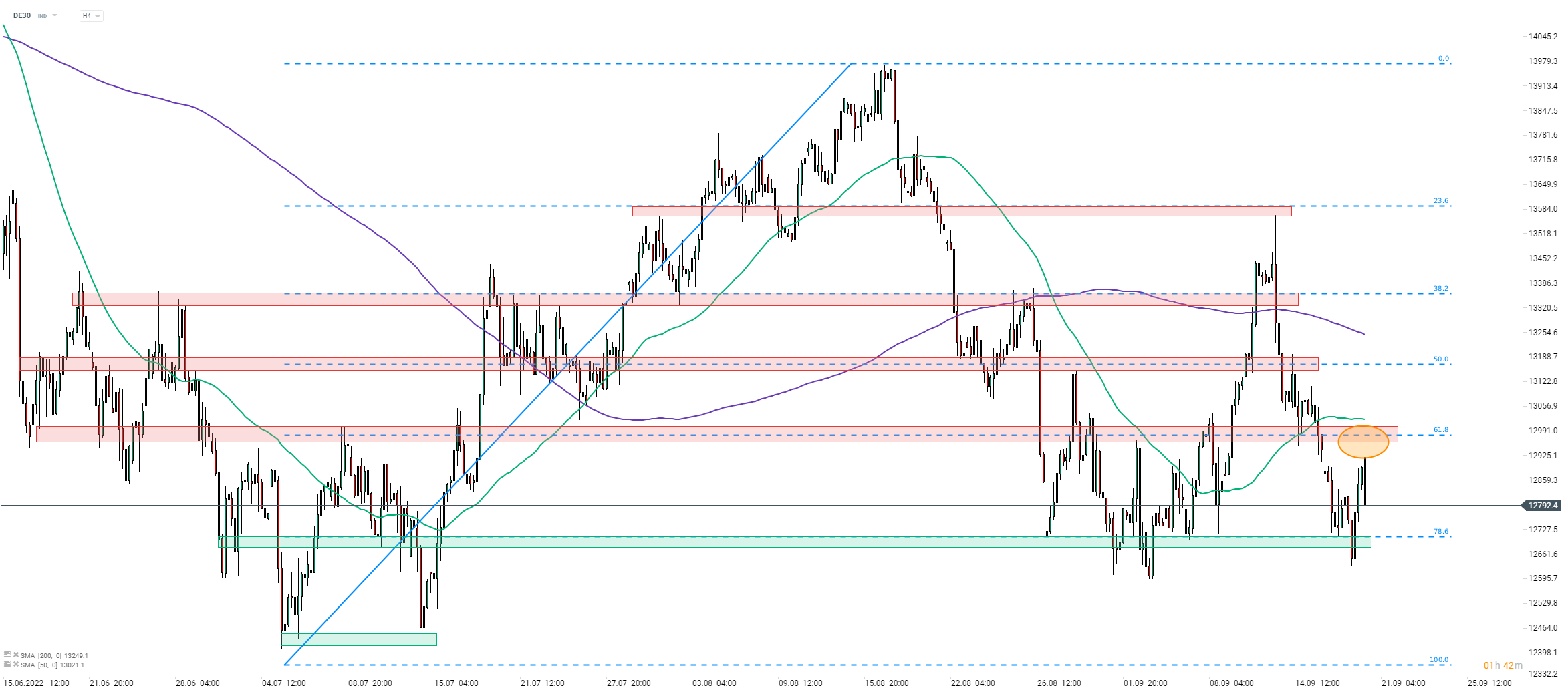 Indicii europeni au oprit recent mișcarea descendentă, declanșată după raportul dezamăgitor CPI al SUA de săptămâna trecută, și au reușit să recâștige teren la începutul unei noi săptămâni. Cu toate acestea, revenirea pare să se fi oprit astăzi, majoritatea indicilor blue chip din Europa de Vest tranzacționându-se mixte. Aruncând o privire asupra graficului DE30 pe intervalul H4, putem observa că indicele german a coborât astăzi în urma unui test eșuat al zonei de rezistență, marcat cu o retragere Fibonacci de 61,8% a mișcării ascendente lansate la începutul lunii iulie 2022. Indicele se tranzacționează mai mult de 150 de puncte de la un maxim zilnic și ar trebui să adâncească retragerea în curs, un test al zonei de suport marcat cu o retragere Fibonacci de 78,6% (zona de 12.700 de puncte).