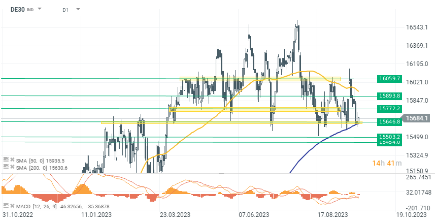 Din punct de vedere tehnic, DAX testează în prezent din nou nivelul de suport de la 15.650 de puncte. Această barieră a reprezentat un nivel de rezistență semnificativ înainte de luna aprilie a acestui an, când indicele a încercat de mai multe ori să o depășească. De atunci, nivelul menționat a fost o zonă cheie de suport, de la care indicele a revenit de 7 ori. În prezent, ne aflăm în timpul celui de-al 8-lea test pe un interval zilnic. Cu toate acestea, divergența de pe MACD și ricoșeele ascendente din ce în ce mai slabe pot indica faptul că puterea de cumpărare se diminuează, iar în curând indicele ar putea sparge definitiv sub nivelul de 15.650 de puncte. Într-un astfel de caz, următoarele zone de suport ar fi zona de 15.450-15.500 de puncte. Sursa: xStation 5.
