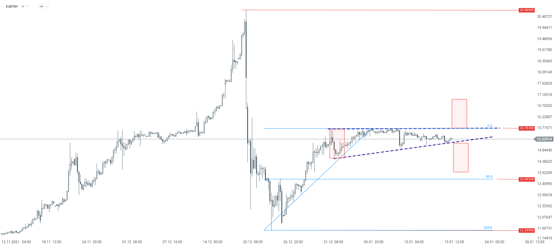 Aruncând o privire asupra perechii valutare EURTRY, putem vedea că s-a tranzacționat într-un model de triunghi ascendent. Volatilitatea perechii a scăzut semnificativ de la ultima întâlnire CBRT și o mișcare mai tehnică ar putea fi posibilă. Perechea testează în prezent limita inferioară a modelului. Traderii ar trebui să se aștepte la o creștere a volatilității în jurul orei anunțului CBRT (13:00 ora României). O spargere a oricărei limite a modelului ar putea declanșa o mișcare de o dimensiune similară cu intervalul modelului (casete roșii).