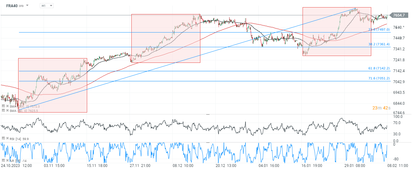 Odată cu revenirea Hang Seng peste 16.000 de puncte, ne putem aștepta la o îmbunătățire treptată a sentimentului în rândul companiilor din domeniul modei, care au fost împovărate de China în ultimele luni. Ca urmare, FRA40 ar putea beneficia. În ultimele zile, putem observa, de asemenea, o formațiune Head and Shoulders inversat. Într-un scenariu ascendent, principala rezistență psihologică va fi, bineînțeles, nivelul de 8.000 de puncte. Pe de altă parte, deteriorarea sentimentului din China ar putea acționa în direcția opusă și să tragă indicele de referință francez chiar și în zona de 7.500 de puncte, unde vedem retragerea Fibonacci de 23,6% și reacțiile anterioare ale prețurilor.