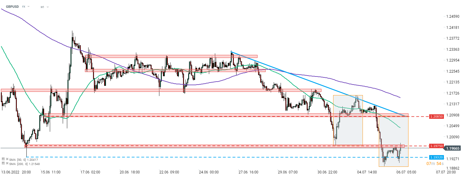 Aruncând o privire asupra graficului H1 al GBPUSD, putem vedea că perechea încearcă să ia o pauză în urma corecției de ieri. Perechea a coborât sub nivelul 1,1932 de la jumătatea lunii iunie și s-a tranzacționat la cel mai scăzut nivel din martie 2020. Cu toate acestea, cumpărătorii au reușit să recapete ceva teren iar perechea a revenit ușor. Zona de rezistență de la 1,1975, marcată cu reacții anterioare ale prețurilor, este testată la momentul scrierii. O rezistență cheie poate fi găsită în zona 1,2085, unde se află limita superioară a unei geometrii locale de piață. O spargere în jos ar semnala o inversare a tendinței pe termen scurt, cel puțin în teorie. Perechea s-ar putea bucura de o volatilitate ridicată astăzi, la 9:00 pm ora României, odată cu publicarea minutelor FOMC și este posibil să afecteze USD.