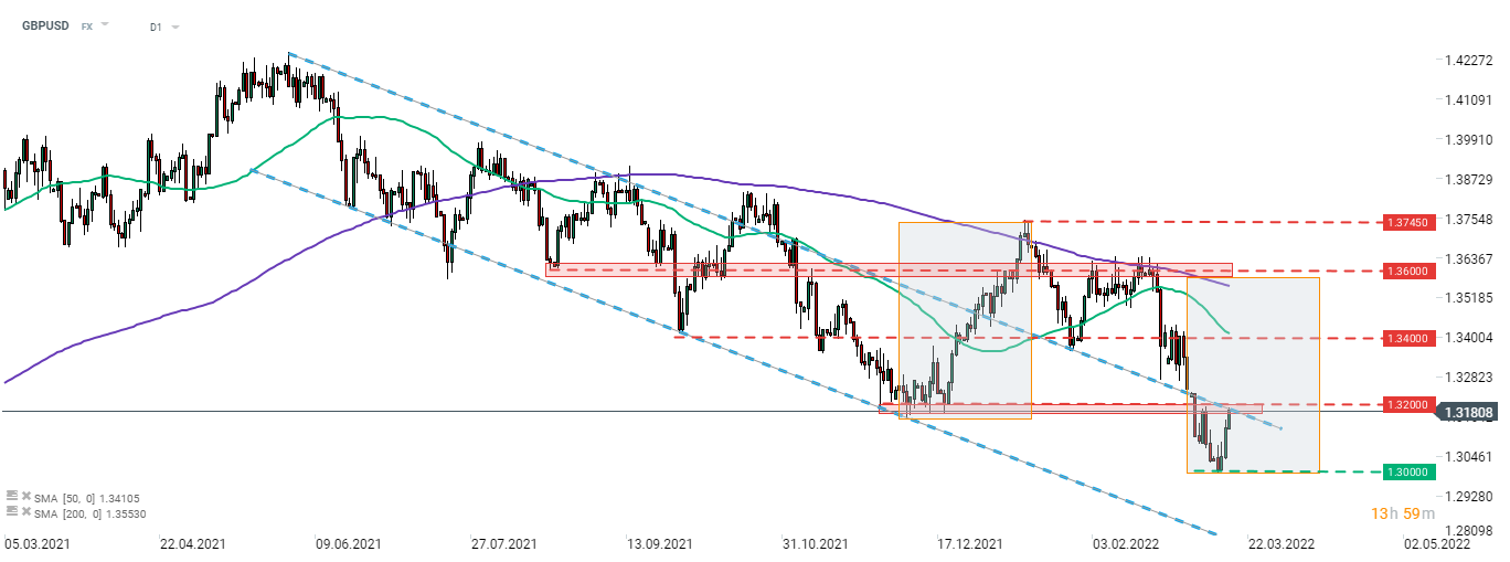 Aruncând o privire asupra graficului GBPUSD pe intervalul D1, putem vedea că tendința descendentă a perechii continuă. GBPUSD a scăzut din nou în intervalul canalului descendent spart anterior, dar a reușit să oprească declinul la 1,3000 și a început să se recupereze ulterior. Zona de rezistență de la 1,3200 este testată la momentul publicării. Este marcat cu limita superioară a canalului menționat mai sus precum și cu reacțiile anterioare ale prețului. Suportul cheie de urmărit este limita superioară a structurii Overbalance la 1,3600, iar o spargere deasupra acesteia ar putea sugera inversarea tendinței. Inversarea tendinței ar fi confirmată cu depășirea maximului local anterior de la 1,3745.