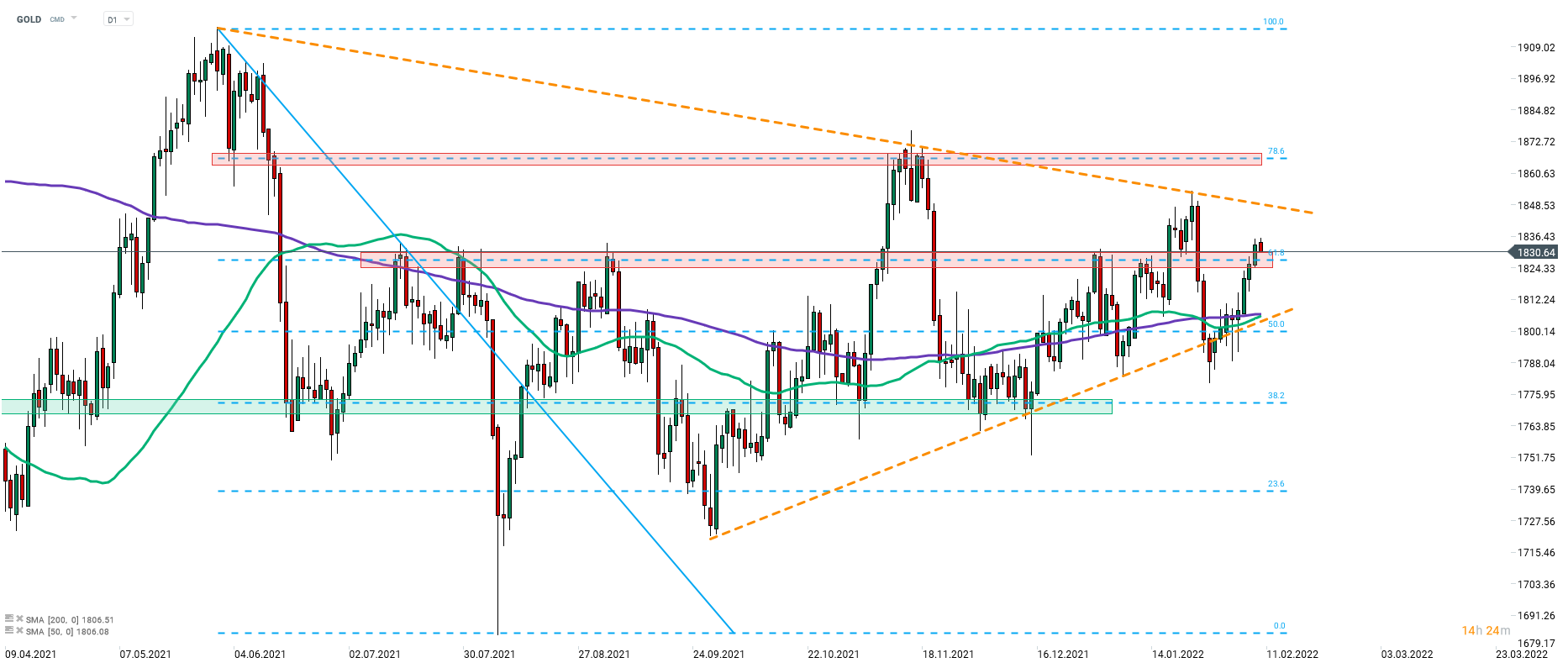 Analizând graficul D1 al aurului, putem observa că prețul metalului prețios a spart deasupra zonei de rezistență marcată cu o retragere Fibonacci de 61,8% a corecției de la jumătatea anului 2021 (1.827 USD). Mișcarea ascendentă ia o pauză astăzi, dar dacă nu are loc o revenire sub zona de preț menționată mai sus, continuarea avansului pare a fi scenariul de bază. Cu toate acestea, o rezistență majoră poate fi găsită în zona de 1.850 USD - limita superioară a unui model simetric de wedge. O spargere deasupra ei ar putea anunța o mișcare ascendentă mai amplă. Pe de altă parte, în cazul în care prețul va scădea din nou sub zona de preț de 1.827 USD, nu poate fi exclus un test al limitei inferioare a modelului în zona 1.805 USD. Rețineți că această zonă este, de asemenea, marcată cu medii mobile de 50 și 200 de sesiuni.