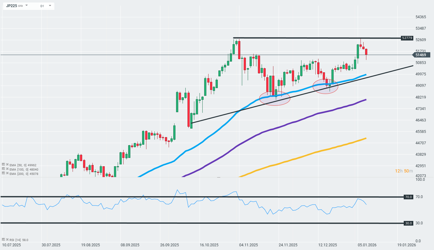 În ciuda reducerilor menționate anterior, care durează de trei zile și sunt determinate în principal de factori geopolitici și economici selectați, contractul JP225 menține o tendință ascendentă pe termen lung, susținută din punct de vedere tehnic de media mobilă exponențială pe 50 de zile (curba albastră din grafic). Limita superioară a configurației tehnice actuale rămâne dublul vârf local din zona de 52.780 de puncte. RSI pentru media pe 14 zile scade sub zona de 70 de puncte, ceea ce este adesea identificat ca un indiciu al supracumpărării instrumentului subiacent.