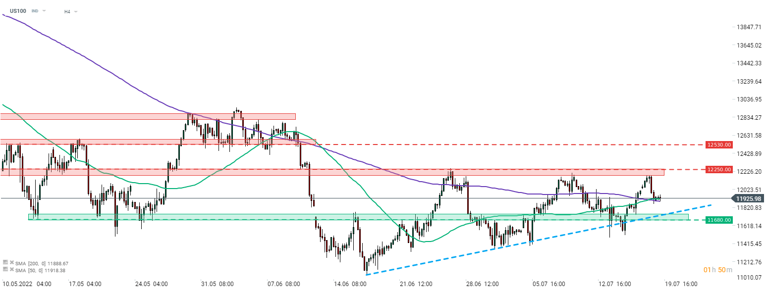 Aruncând o privire la indicele tehnologic Nasdaq-100 (US100) pe intervalul H4, putem observa că indicele s-a retras din zona de rezistență de 12.175 - 12.250 de puncte ieri și a atins zona de 11.900 de puncte în care mediile mobile de 50 și 200 de puncte pot fi găsite. O scădere a fost oprită în această zonă, cel puțin pentru moment. În cazul în care vânzătorii recâștigă controlul și împing prețul sub mediile mobile menționate mai sus, ar putea fi o retragere către zona de suport de la 11.700 de puncte.