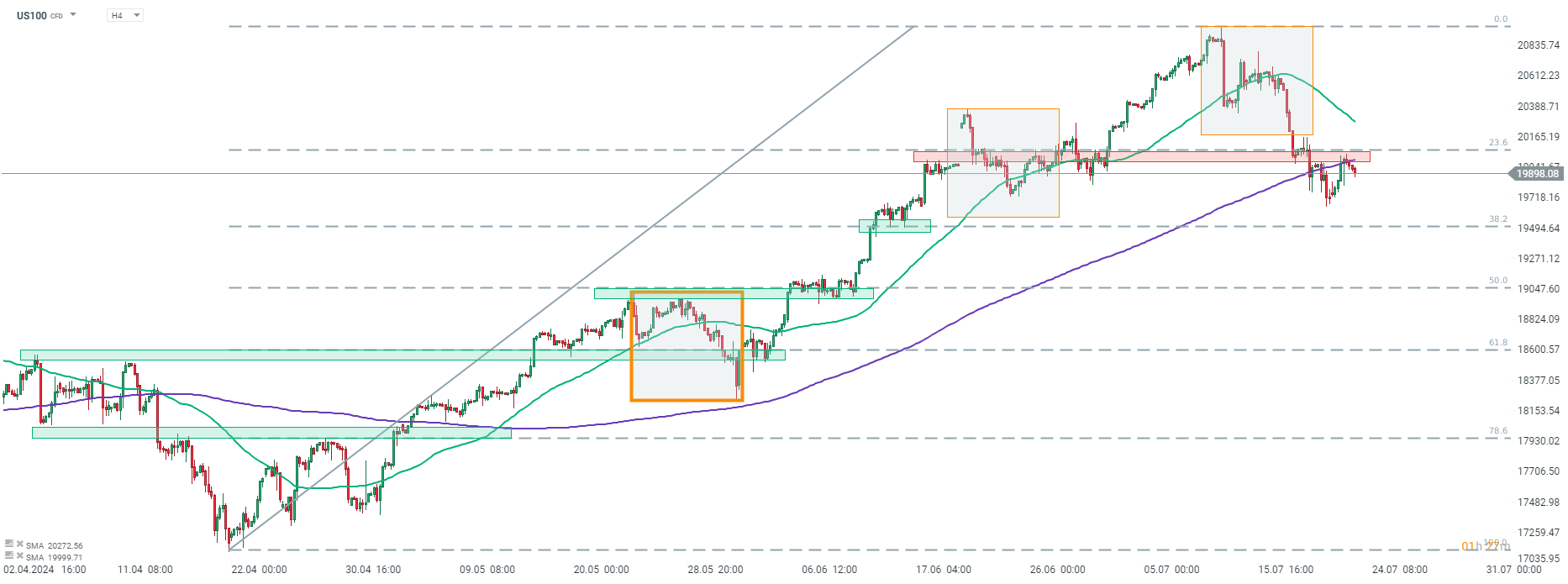 Aruncând o privire asupra indicelui US100 pe intervalul H4, putem vedea că indicele a recuperat ușor ieri, dar încercarea de a lansa o mișcare mai mare a fost oprită de zona de rezistență situată sub retragerea Fibonacci de 23,6% a mișcării ascendente lansate în a doua jumătate a lunii aprilie 2024. Un aspect de remarcat este că indicele a depășit săptămâna trecută limita inferioară a structurii Overbalance, ceea ce sugerează că tendința a devenit bearish. Cu toate acestea, rapoartele de câștiguri ale companiilor Big Tech ar putea ajuta la inversarea tendinței și ar putea împinge indicele înapoi spre maximele sale istorice. În cazul în care taurii nu reușesc să recâștige controlul asupra pieței și retragerea se adâncește, nivelul de suport pe termen scurt de urmărit sunt marcate cu retragerile Fibonacci de 38,2% și 50% la 19.500 și 19.050 de puncte.