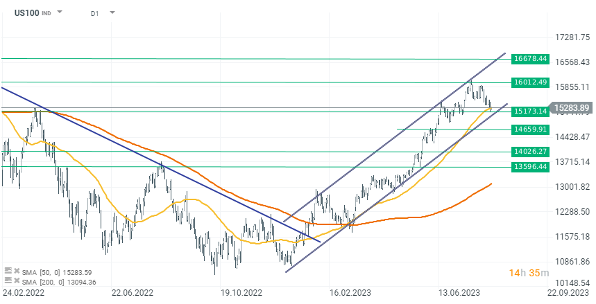 La US500 și US100, observăm o situație interesantă. Ambele instrumente se tranzacționează aproape de limita inferioară a canalului ascendent, care a fost respectat de la începutul lunii martie 2023. Prin urmare, dacă datele de astăzi se situează sub așteptări, ar putea provoca o revenire a indicilor și o euforie a acțiunilor determinată de scăderea inflației. În caz contrar, piața ar putea reacționa cu scăderi și ar putea depăși linia de suport cheie.