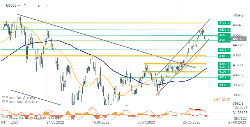 US500, indicele se tranzacționează cu 0,50% mai mult astăzi, în jurul valorii de 4.513. Prețul indicelui se află ușor deasupra liniei de suport cheie de la nivelul de 4.500 de puncte (marcată pe grafic într-o zonă verde-galbenă). În plus, limita inferioară a tendinței de creștere converge la același nivel, ceea ce poate crea o zonă de sprijin excepțional de puternică.