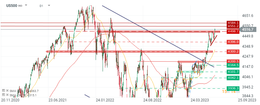 Alimentați de aceste cifre CPI atât de scăzute, investitorii au împins indicele SP500 la noi maxime pentru acest an, în jurul valorii de 4.472 de puncte, în timp ce contractele futures de pe platforma XTB (US500) au depășit 4.500 de puncte iar indicele se tranzacționează în prezent în jurul valorii de 4.520 de puncte. Privind graficul din perspectivă tehnică, putem observa următoarea zonă de rezistență în jurul valorii de 4.550 - 4.580 puncte. Zona de suport se află acum la nivelul de 4.500, după depășirea de ieri, și mai departe la 4.400 de puncte.