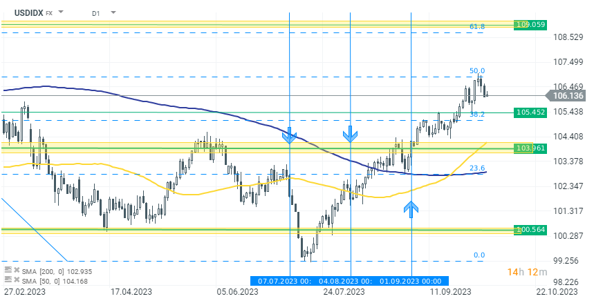 Impulsul ascendent al dolarului american continuă să scadă și în prezent și-a oprit tendința de creștere tocmai la retragerea Fibonacci de 50% de la maximele recente atinse în septembrie 2022. Din punct de vedere sezonier, luna octombrie favorizează activele cu risc mai ridicat, ceea ce afectează și ieșirile de capital din activele mai sigure, precum dolarul. Cu un an în urmă, în aceeași perioadă, în jurul sfârșitului lunii septembrie, am înregistrat un vârf local după creșteri semnificative cauzate de înăsprirea bruscă a politicii monetare a Fed și de deteriorarea perspectivelor. În acest an, într-o perioadă similară, am văzut un sentiment similar pe piețe. Acum, intrăm în următoarea lună, cu dolarul începând deja o corecție minoră.