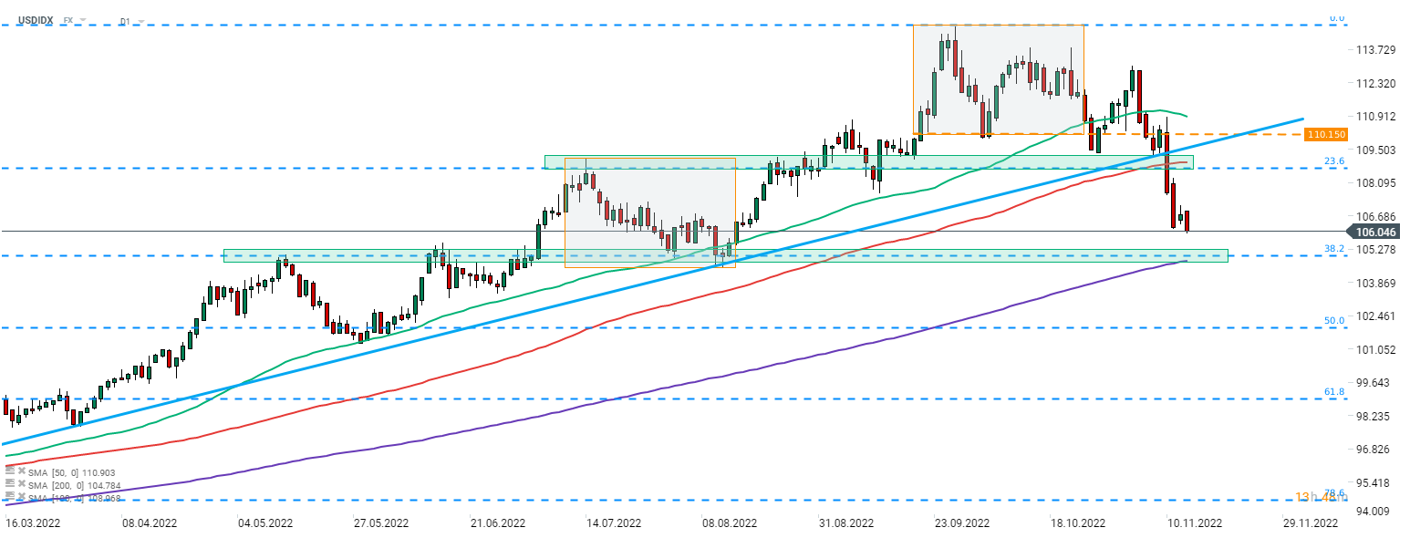 Aruncând o privire asupra graficului indicelui USD (USDIDX) pe intervalul D1, putem vedea că indicele continuă să se miște mai jos după o spargere mai devreme sub limita inferioară a geometriei pieței și linia ascendentă de trend. Următoarea zonă de suport majoră de urmărit poate fi găsită în zona 105,00 și este marcată cu o retragere Fibonacci de 38,2% din mișcarea ascendentă lansată la începutul anului 2021 precum și cu reacțiile anterioare ale prețurilor și cu media mobilă de 200 de sesiuni.