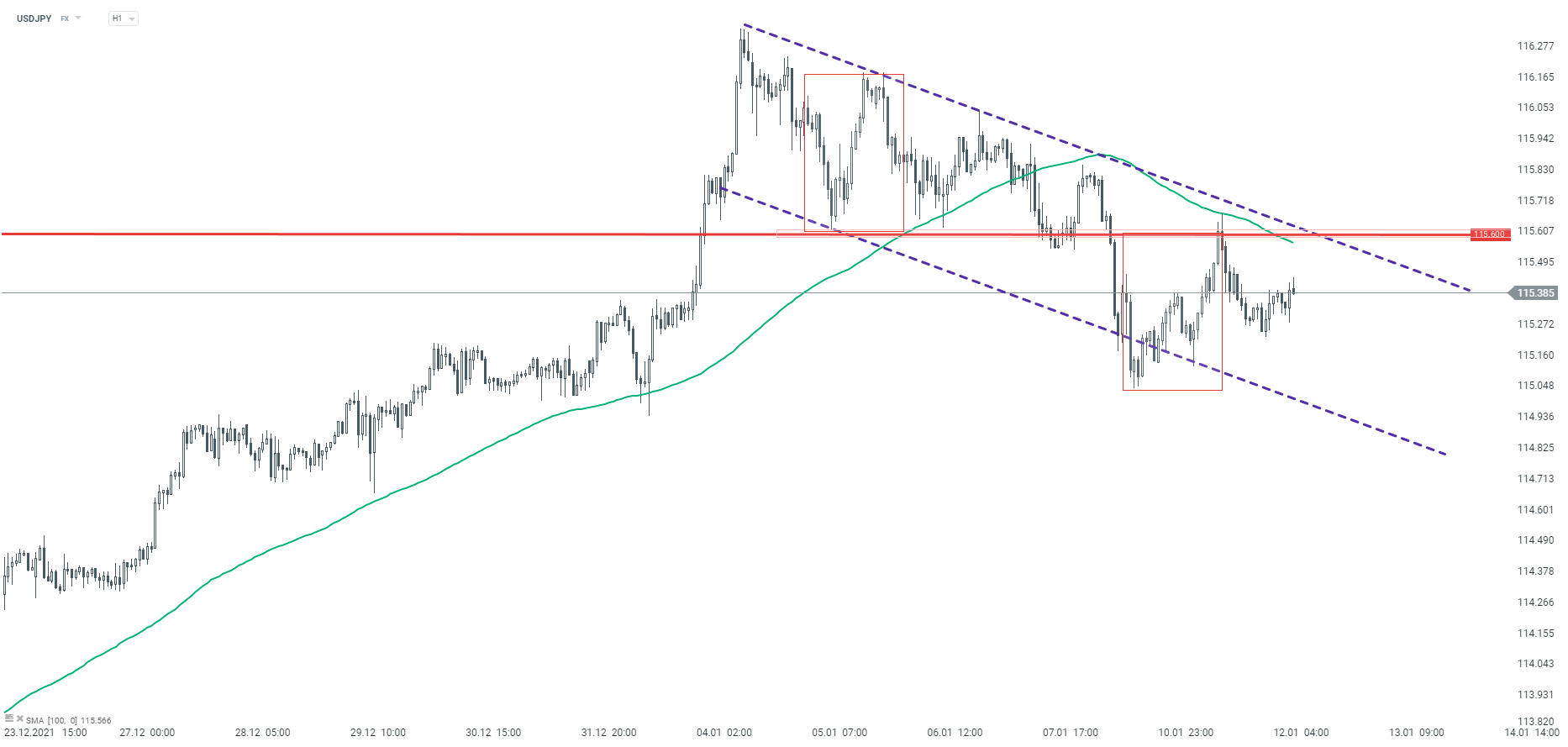 Analizând graficul USDJPY pe intervalul H1, putem vedea că perechea s-a tranzacționat în interiorul unui canal descendent în ultima vreme. Perechea a testat recent media mobilă de 100 de ore de două ori (linia verde), dar nu a reușit să depășească în niciuna dintre încercări. În cazul în care datele CPI din SUA de astăzi depășesc așteptările și USD primește un impuls, această medie mobilă va fi prima rezistență pe termen scurt de urmărit. Zona 115,60 care găzduiește limita superioară a canalului și limita superioară a structurii Overbalance ar trebui, de asemenea, să ofere rezistență.