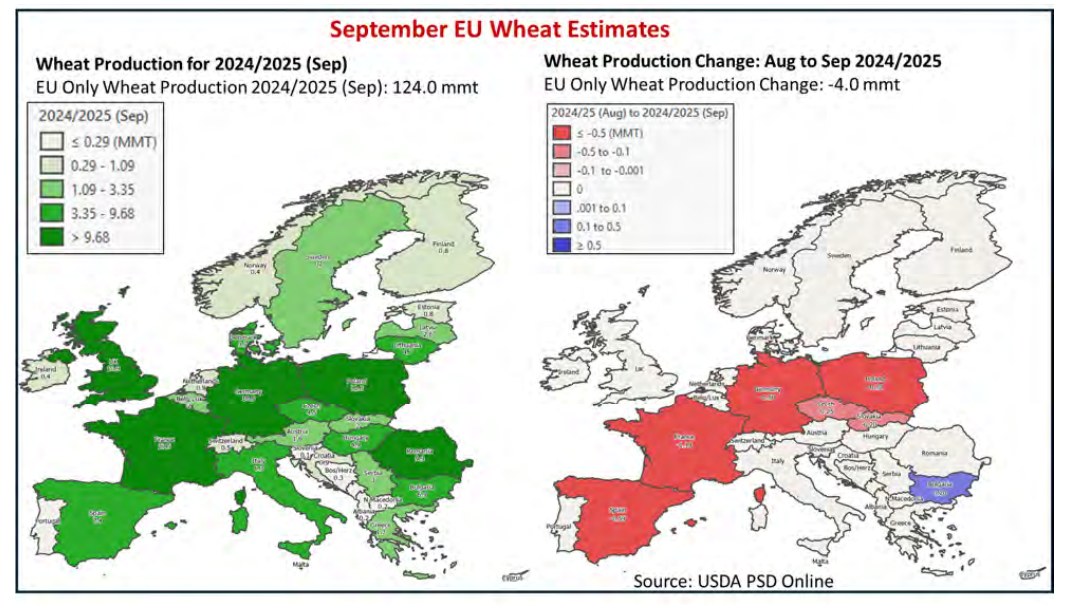 - Raportul USDA din septembrie a raportat că grâul a terminat recoltarea în UE, iar culturile sunt „dezamăgitoare și întârziate în special în nord-vestul Europei” din cauza precipitațiilor excesive, care îi împiedică pe fermieri să muncească, iar bolile plantelor în creștere împiedică culturile de cereale.