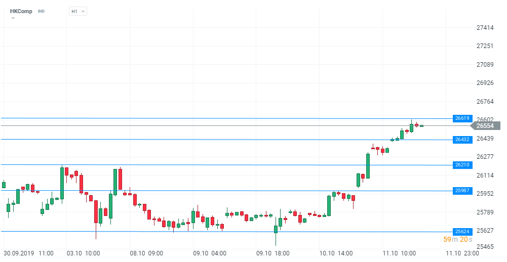 Ultima sesiune a săptămânii a adus vești bune de pe plan comercial, unde tensiunile dintre cele mai mari economii ale lumii par să se fi aplanat într-o oarecare măsură, iar un acord pare a fi tot mai aproape. Aseară, Președintele Donald Trump a declarat că discuțiile cu China decurg ”foarte bine”, iar negocierile vor fi reluate vineri. În plus, acesta a spus că plănuiește să se întâlnească cu vice-premierul chinez, Liu He, vineri la Washington. Această veste a fost considerată optimistă de către investitori, ca urmare a informațiilor din ultima perioadă cu privire la posibilitatea ca delegația chineză să-și scurteze întâlnirea în SUA, sugerând un posibil progres al negocierilor, care ar putea duce la un acord. În acest context, piețele de capital s-au apreciat astăzi, iar indicele chinez HKComp se numără printre cei mai mari beneficiari, la momentul scrierii, câștigând aproximativ 2,50%. Mișcarea ascendentă ar putea continua, în eventualitatea în care ultimele zvonuri optimiste se vor confirma. Anume, în timpul nopții, mai multe publicații media au sugerat că cele două superputeri ar putea încheia un acord parțial care se aplică unor aspecte legate de planul valutar și de cumpărarea de produse agricole, dar care ar putea prevede și o amânare a majorărilor de taxe vamale care ar trebui să intre în vigoare pe 15 octombrie. În plus, conform informațiilor The New York Times, administrația Trump ia în considerare să permită furnizorilor americani să vândă materii prime către Huawei. Problematici mai complexe precum cele legate de presupuse furturi de proprietate intelectuală și de transferuri forțate de tehnologie ar putea fi dezbătute la o dată ulterioară. Un alt semnal optimist a venit în timpul sesiunii asiatice, China prezentând un program exact pentru deschiderea industriei sale financiare. Instituția de reglementare chineză a declarat că entitățile ce oferă servicii financiare cu instrumente futures, titluri de valoare și fonduri mutuale vor putea să aplice pentru control total al unor companii onshore începând din 2020. Acest scenariu pare favorabil pentru piețele de capital, iar indicele chinez profită de acest context și recuperează o parte din pierderile suferite în ultima perioadă. În timpul sesiunii de azi, cotația a depășit cu o oarecare ușurință nivelurile de rezistență de la 26210 și 26432, iar în acest moment pare să se îndrepte către 26619. Impulsul ascendent s-ar putea extinde în eventualitatea în care se va ajunge la o înțelegere sau veștile bune vor continua. Totuși, investitorii ar trebui să rămână vigilenți întrucât nivelul de optimism al traderilor pare a fi la cote destul de înalte, existând o ușoară tendință părtinitoare către aspectele pozitive ale informațiilor, iar, în eventualitatea în care nu se va ajunge la un acord sau discuțiile vor intra din nou în impas, dezamăgirea ar putea fi la cote ridicate și ar putea duce la mișcări corective ample.