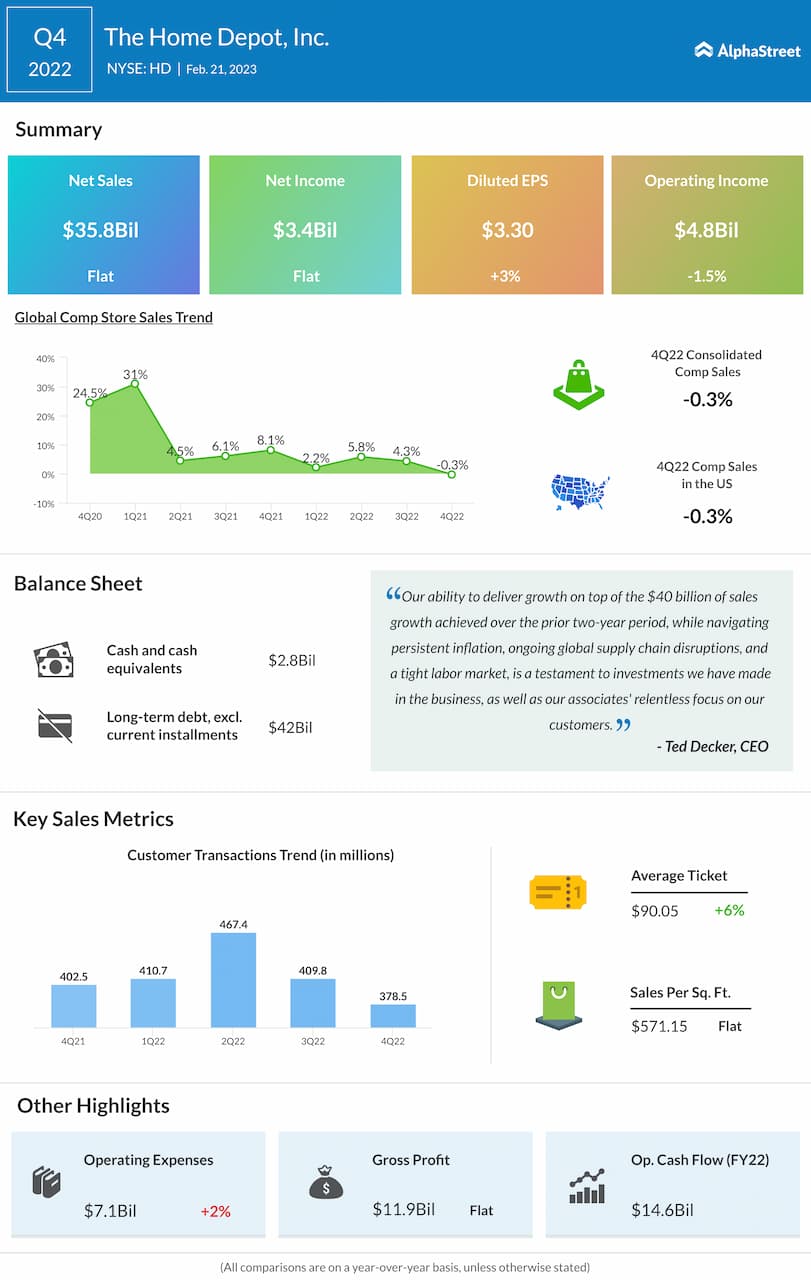 - „Anul fiscal 2022 a fost un alt an record pentru Home Depot deoarece echipa noastră a continuat să execute cu succes într-un mediu provocator și dinamic”, a declarat CEO-ul Ted Decker. „Abilitatea noastră de a produce o creștere pe lângă creșterea vânzărilor de 40 de miliarde de dolari obținute în perioada precedentă de doi ani, în timp ce navigăm în mediul inflaționist persistent, întreruperile lanțului global de aprovizionare în curs și o piață a forței de muncă strânsă, este o dovadă a investițiilor pe care le-am făcut în afacerea precum și concentrarea neobosită a asociaților noștri asupra clienților noștri.”