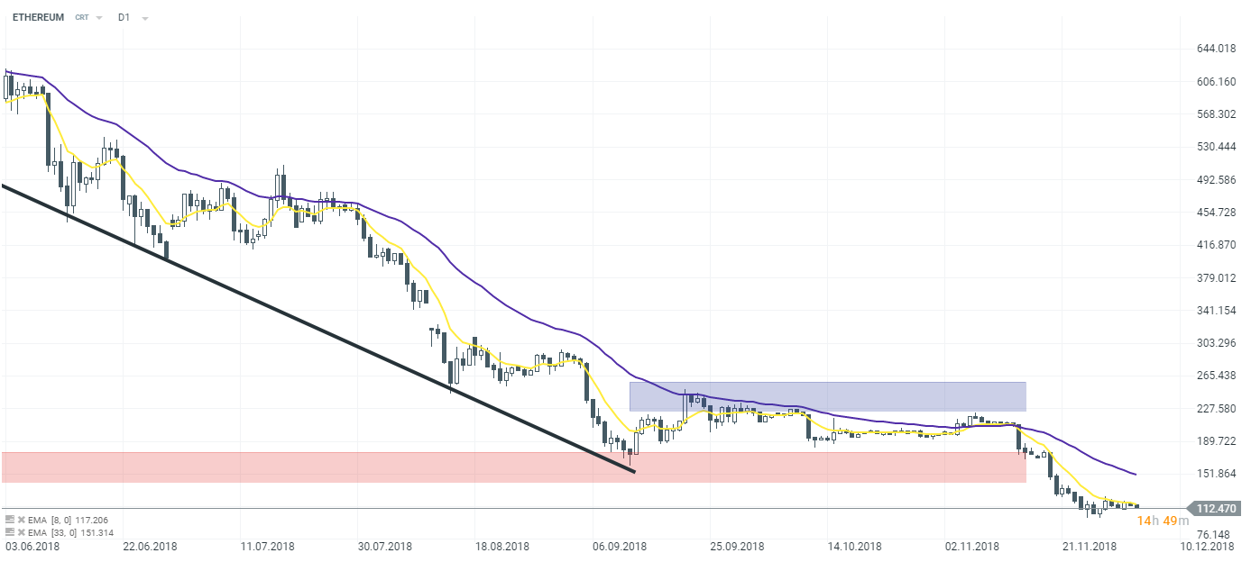 Ethereum (ETHEREUM în xStation5) se consolidează după o perioadă semnificativă de scădere suferită în ultimele zile. Sursa: xStation5