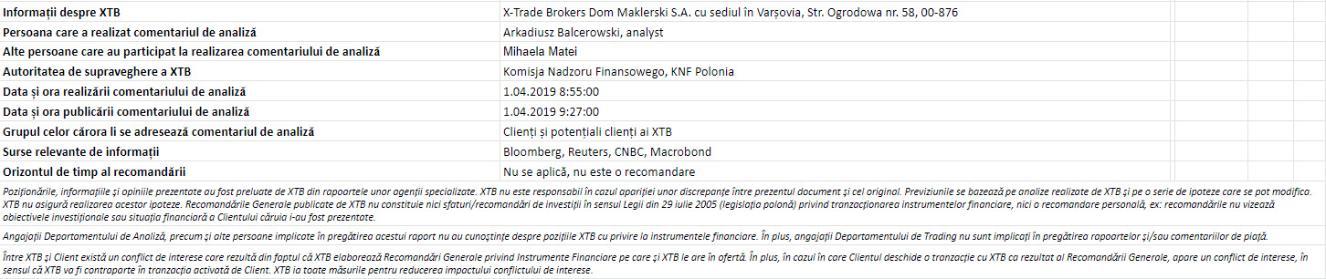 "Acest material este o comunicare de marketing în sensul articolului 24 alineatul (3) din Directiva 2014/65 / UE a Parlamentului European și a Consiliului din 15 mai 2014 privind piețele de instrumente financiare, și de modificare a Directivei 2002/92 / CE și a Directivei 2011 / 61 / UE (MiFID II). Comunicarea de marketing nu este o recomandare de investiții sau o recomandare de informații sau o recomandare care sugerează o strategie de investiții în sensul Regulamentului (UE) nr. 596/2014 al Parlamentului European și al Consiliului din 16 aprilie 2014 privind abuzul de piață ( reglementarea abuzului de piață) și de abrogare a Directivei 2003/6 / CE a Parlamentului European și a Consiliului și a Directivelor Comisiei 2003/124 / CE, 2003/125 / CE și 2004/72 / CE și a Regulamentului delegat (UE) 2016/958 al Comisiei din 9 596/2014 al Parlamentului European și al Consiliului în ceea ce privește standardele tehnice de reglementare pentru aranjamentele tehnice pentru prezentarea obiectivă a recomandărilor de investiții sau a altor informații care sugerează strategii de investiții și pentru dezvăluirea de interese particulare sau indicații de conflicte de interese sau orice alte sfaturi, inclusiv în domeniul consultanței în materie de investiții, în sensul Legii privind tranzacționarea cu instrumente financiare din 29 iulie 2005 (de ex. Journal of Laws 2019, articolul 875, astfel cum a fost modificat). Comunicarea de marketing este pregătită cu cea mai mare diligență, obiectivitate, prezintă faptele cunoscute autorului la data pregătirii și este lipsită de orice elemente de evaluare. Comunicarea de marketing este pregătită fără a lua în considerare nevoile clientului, situația sa financiară individuală și nu prezintă nicio strategie de investiții în niciun fel. Comunicarea de marketing nu constituie o ofertă de vânzare, oferire, abonament, invitație la cumpărare, reclamă sau promovare a oricărui instrument financiar. XTB SA nu este responsabilă pentru acțiunile sau omisiunile niciunui client, în special pentru achiziționarea sau cedarea instrumente, întreprinse pe baza informațiilor conținute în această comunicare de marketing. XTB SA nu va accepta răspunderea pentru nicio pierdere sau daună, inclusiv, fără limitare, orice pierdere care poate apărea direct sau indirect, efectuată pe baza informațiilor conținute în această comunicare de marketing. În cazul în care comunicarea de marketing conține informații despre orice rezultat cu privire la instrumentele financiare indicate în acestea, acestea nu constituie nicio garanție sau prognoză cu privire la rezultatele viitoare. Performanțele anterioare nu indică neapărat rezultatele viitoare și orice persoană care acționează pe baza acestor informații o face pe propriul risc. Acest material nu este emis pentru a influenta deciziile de tranzacționare ale niciunei persoane. Informațiile cuprinse în cadrul acestui material nu sunt prezentate pentru a fi aplicate, copiate sau testate în cadrul tranzacțiilor dumneavoastră. Informațiile cuprinse în cadrul acestui material sunt emise în baza experienței proprii a emitentului și nu reprezintă o recomandare individuală, nu vizează atingerea anumitor obiective, randamente financiare și nu se adresează nevoilor niciunei persoane anume care ar primi-o. Premisele acestui material nu au în vedere situația și persoana dumneavoastră deci nu recomandăm utilizarea acestor informații sub orice formă. Utilizarea informațiilor cuprinse în cadrul acestui material în orice modalitate se face pe propria dumneavoastră răspundere. Acest material este emis de către un analist pentru care își asumă răspunderea XTB SA, persoană juridică autorizată de KNF – Autoritatea de Supraveghere Financiara din Polonia."