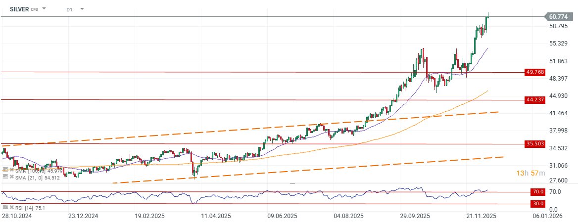 Astăzi, argintul se apreciază cu 0,40% la momentul scrierii. După ce a atins un nou maxim istoric la 61,594 dolari pe uncie, investitorii au marcat o parte din profituri, cotația retrăgându-se sub pragul de 61 de dolari. Impulsul ascendent actual rămâne în continuare solid, dar, privind indicatorul de putere relativă (RSI) observăm că ne aflăm în zona de supracumpărare la 75 de puncte.