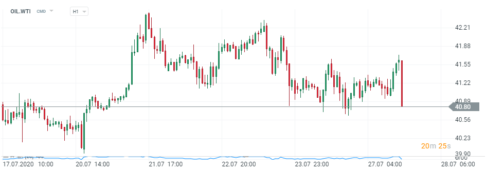 Petrolul a traversat un început de săptămână extrem de agitat. După o deschidere ezitantă în timpul căreia prețul WTI a oscilat în vecinătatea pragului de 41 de dolari per baril, cumpărătorii au prins mai mult curaj și au reușit să împingă prețul către zona de 42 de dolari per baril. Evoluția pozitivă a fost favorizată de dolarul slab și de măsurile de stimulare așteptate să fie anunțate de către oficialii americani. Totuși, potențialul de creștere a fost limitat de creșterea numărului de cazuri la nivel global și de tensiunile dintre Statele Unite și China.