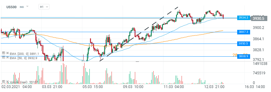 Analizând graficul H1, putem observa o potențială apariție a unei formațiuni Double Top în zona maximelor istorice. Chiar în momentul actual se încearcă spargerea neckline-ului la aproximativ 3.934,3 puncte. Dacă această testare va fi confirmată, prețul ar avea drum deschis de scădere până în zona 3.914 puncte, unde se află punctul de plecare al secvenței de creștere. În continuarea, un factor de risc pentru piețe este reprezentat de randamente, în special de viteza cu care se apreciază acestea, motiv pentru care această tematică va continua să fie în atenția investitorilor.