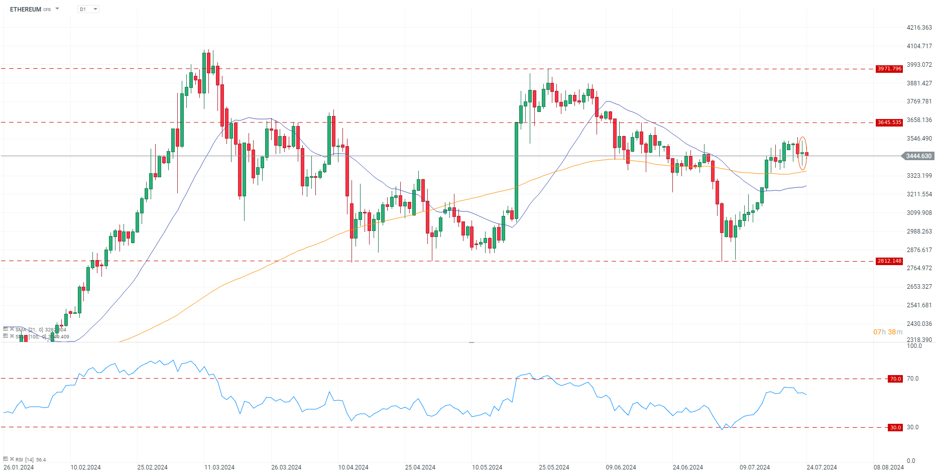 Prima zi de tranzacționare a ETF-urilor spot a adus volatilitate pentru prețul ETHEREUM, de aici umbrele ample și corpul redus ale lumânării. Sursa: xStation 5
