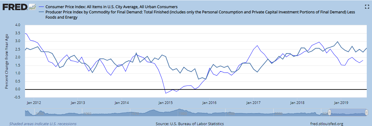 Pentru producători, tendința de creștere a prețurilor s-a accentuat, datele pentru luna august arată un avans de 2.3% anualizat, 0.3% lunar, față de 2.2%, respectiv 0.2% așteptat pentru seria de date care e construită pentru a arăta trendul (varianta de bază). O variantă ajustată, care include doar porțiunea pentru consum privat și investiții de capital privat este prezentată mai jos (seria vernil, aflată în ultimele luni mai sus), alături de inflația CPI anualizată, mediu urban. Se poate observa cum, după perioade de distanțare uneori de ordinul lunilor, cele 2 serii tind spre convergență. În condițiile în care tensiunile comerciale sunt așteptate a continua să pună presiune pe costul materiilor prime și al anumitor mărfuri și componente, iar venitul mediu orar crește peste inflație, cu o piață a muncii relativ strânsă, ar fi de așteptat ca, în timp, seria CPI să cunoască o revenire. Cu toate că o valoare a inflației pentru luna august, anunțată mâine, de peste 1.8% (valoarea anterioară și cea așteptată) este acum mai probabilă, mai important va fi trendul lunilor următoare. Fed, încurajată de Trump să taie dobânda la 0 și apoi în teritoriu negativ ar putea înțelege, privind graficul de mai jos, că spațiul pentru manevră nu este unul foarte amplu, fără riscul de a accentua, în viitor presiunile inflaționiste.
