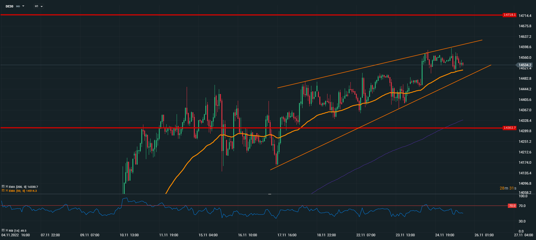 În acest context, indicele german DAX pierde aproximativ 0,25% la momentul publicării. Totuși, acesta continuă să evolueze în interiorul unei formațiuni ascendente de Wedge. În același timp nu trebuie să pierdem din vedere faptul că prețul se apropie de media mobilă de 50 de perioade (linia portocalie) la aproximativ 14.514 puncte care a reprezentat un nivel de suport destul de solid pentru întreaga perioadă de timp în care cotația a evoluat în interiorul modelului. În acest context, tendința principală este așteptată să continue a fi pozitivă.