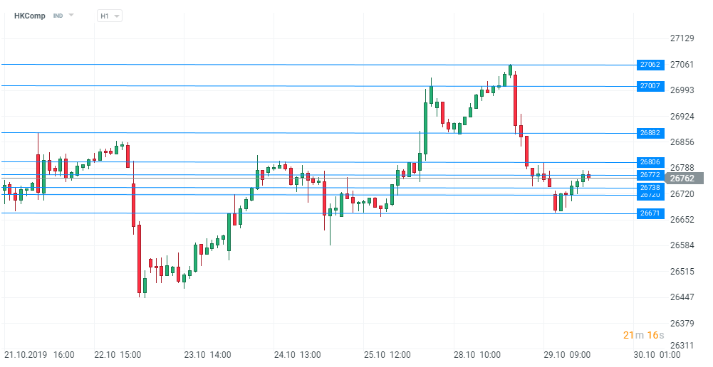 După o primă sesiune a săptămânii pozitive în timpul căreia cotația HKComp a ajuns în vecinătatea nivelului de rezistență de la 27062 și a atins cel mai ridicat nivel din luna octombrie, optimismul a fost alungat rapid de către imaginea incertă și pesimistă trasată de evenimentele menționate anterior. Astfel, în doar câteva ore, indicele a căzut din zona 27045 până deasupra suportului de la 26671, ceea ce presupune o depreciere de aproximativ 1,33%. Ulterior, a avut loc o ușoară tendință de revenire iar, la momentul scrierii, prețul este la un pas de testarea nivelului de rezistență de la 26772. În cazul în care vor apărea informații optimiste de pe plan comercial sau legate de problemele interne este posibil ca, pe termen scurt, impulsul ascendent să se extindă. Totuși, pe termen mediu și lung perspectivele nu sunt optimiste și tind să încline în sens descendent pentru indice.