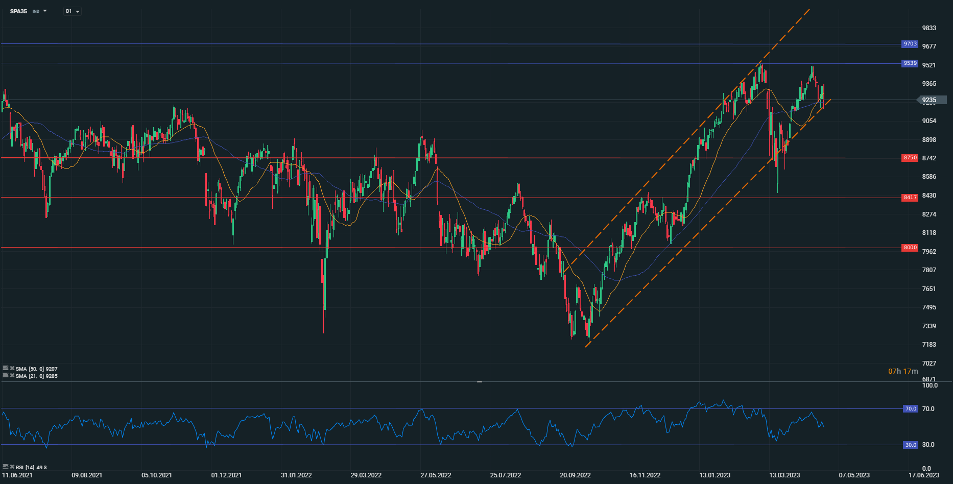 Acțiunile europene sunt în drum către a încheia sesiunea de vineri în scădere, iar indicele spaniol IBEX 35 (SPA35) este unul dintre codași. Etalonul iberic se află în cadrul unei mișcări de recuperare din luna octombrie a anului trecut, timp în care cotația a dezvoltat o evoluție în interiorul unui canal ascendent. Astfel, cotația a crescut din zona de 7.215 puncte la cel mai ridicat nivel din februarie 2020 la 9.540 de puncte, ceea ce presupune o creștere de aproximativ 32%. Acest nivel a fost retestat pe 19 aprilie reconfirmând importanța zonei de rezistență. De acolo cotația a scăzut și a testat limita inferioară a canalului, pe fondul pesimismului de pe piața largă. Având în vedere cum a evoluat indicele în trecut, în cazul în care atitudinea generală este pesimistă, ne-am putea confrunta cu o posibilă spargere a limitei inferioare a formațiunii. Însă, rămâne de văzut dacă va fi o spargere falsă, precum a fost cazul la jumătatea lunii martie odată cu apariția problemelor din sectorul bancar, sau dacă va fi o corecție. În cazul unei îmbunătățiri a sentimentului general al pieței, un ricoșeu ar fi posibil, zona de 9.540 de puncte fiind obiectivul cumpărătorilor.
