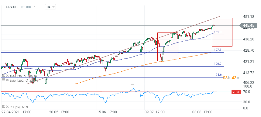 Din punct de vedere tehnic, graficul H4 al ETF-ului SDPR S&P 500 Trust ne arată o imagine optimistă. Astfel, trendul ascendent pe termen lung început în martie 2020 continuă să fie valid, iar semnalele sunt în continuare pozitive. Chiar dacă prețul a spart sub limita inferioară a canalului de creștere, acesta continuă să evolueze deasupra celor două medii mobile, de 50 și 200 de perioade (liniile albastră și galbenă) fapt ce ne indică prezența unui impuls solid din partea cumpărătorilor. Totuși, indicatorul de sentiment RSI testează pragul de 70 de puncte, situație care, în trecutul apropiat, a dus la corecții de moment pe grafic. În ipoteza în care un astfel de scenariu se va materializa, secvența de creștere pe termen lung ar rămâne validă atâta timp cât prețul nu va coborî sub latura inferioară a dreptunghiului roșu de pe grafic (conform metodologiei Overbalance). În plus, cea mai recentă scădere s-a încheiat cu un ricoșeu din media mobilă de 200 de perioade, fapt care ne confirmă importanța acestui nivel tehnic.
