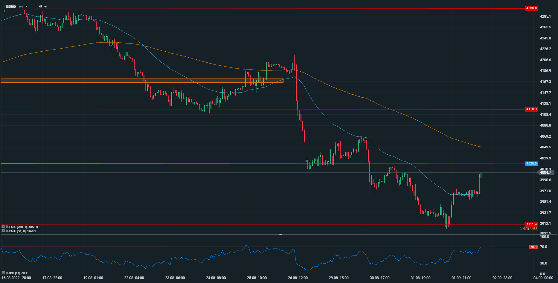 Din punct de vedere tehnic, indicele US500 a răspuns pozitiv după publicarea datelor, reușind să se distanțeze din zona mediei mobile de 50 de perioade (dreapta albastră deschis) în zona de 3.966 de puncte. Cumpărătorii par să vizeze testarea zonei de 4.020 de puncte, însă s-ar putea să se confrunte cu o problemă. Indicatorul RSI (dreapta albastră din graficul de jos) se află în zona limitei superioare de supracumpărare de 70 de puncte, fapt care ar putea să ducă la o echilibrare a forțelor dintre cumpărători și vânzători. Următoarele ore ar putea aduce un nivel mai ridicat de volatilitate, până când investitorii vor reuși să stabilească o direcție.