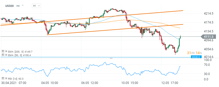 Analizând graficul H1 al US500, observăm că prețul a ricoșat în apropierea zonei de suport de la 4.020 de puncte, care este marcată de o retragere exterioară Fibonacci de 121,3% din mișcarea ascendentă de la începutul lunii martie. Impulsul pare a fi unul hotărât, fiind depășită și media mobilă de 50 de perioade (linia albastră). Următoarele două obiective pentru investitori ar putea fi media mobilă de 200 de perioade (linia portocalie) și limita inferioară a canalului ascendent recent din zona 4.164 puncte. Piețele și-au pierdut puțin încrederea că Fed are controlul inflației și temerile erau că banca centrală ar putea aștepta prea mult pentru a aborda creșterea. Piața nu pare a se afla într-o situație confortabilă în acest moment.