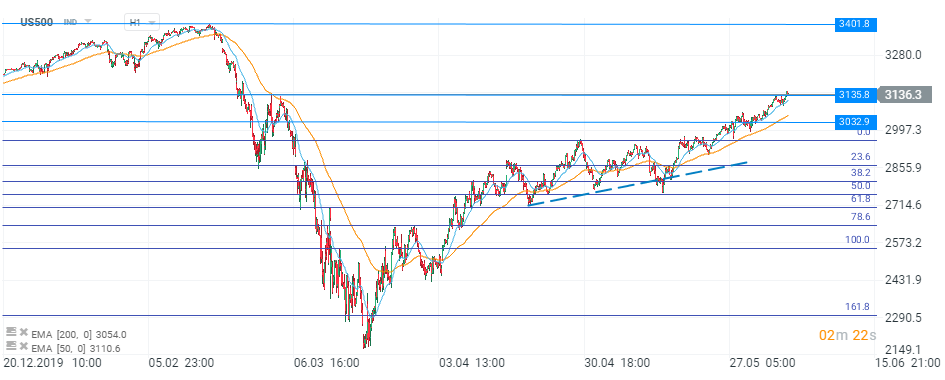 În ceea ce privește situația grafică, US500 se află într-un punct cheie, testând un maxim local de la 3135 puncte. Nivelul se poate dovedi o rezistență puternică care ar putea pune în pericol secvența ascendentă actuală. Mai mult, se observă și o discrepanță între starea economie și a pieței bursiere, cele două fiind corelate direct în condiții normale. Astfel, US500 a înregistrat cea mai bună secvență de creștere de 50 de sesiuni de tranzacționare din istorie, în timp ce în economia americană, 25% dintre angajați au completat cereri pentru ajutor de șomaj. În eventualitatea în care vom asista la un raport NFP dezamăgitor, am putea asista la o corecție către nivelul de suport de la 3033 de puncte, care reprezintă un prag important pe intervalul D1.
