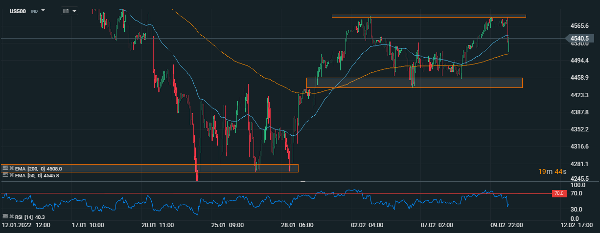 Din punct de vedere tehnic, corecția inițială suferită după publicarea datelor pare să fi fost doar o sperietură de moment. Deși, la un moment dat, indicele US 500 pierdea peste 1,6%, acesta a reușit să recupereze mare parte din scăderi iar la momentul scrierii se află cu 0,25% sub nivelul de deschidere al sesiunii. Nivelul de la 4.510 puncte s-a dovedit a fi un suport solid, fiind susținut și de media mobilă de 200 de perioade (linia albastră). Pe de altă parte, creșterea ar putea fi limitată de rezistența de la 4.586 - 4.589 puncte (dreptunghiul portocaliu) care s-a dovedit a fi un obstacol mult prea solid pentru cumpărători de la începutul lunii februarie în trei rânduri.