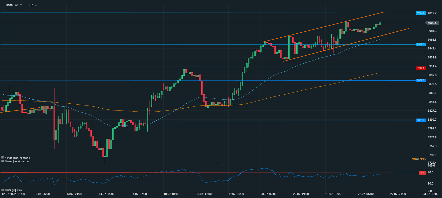 Din punct de vedere tehnic, US500 evoluează în interiorul unui canal ascendent de trend. Din acest punct de vedere, mișcarea ascendentă pare a fi destul de solidă, cel puțin pentru moment. Cele două limite ale canalului reprezentând două puncte de interes. Pentru cumpărători, următorul obiectiv pare a fi pragul 4.020 de puncte. O volatilitate superioară ar putea apărea săptămâna viitoare înainte de decizia de politică monetară din SUA.