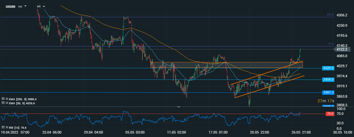 Din punct de vedere tehnic, prețul a reușit să spargă limita superioară a unui canal de creștere care a persistat pentru o săptămână. Impulsul ascendent de ieri a facilitat și depășirea zonei de rezistență 4.020 - 4.053 de puncte (dreptunghiul portocaliu). În această dimineață a avut loc o perioadă de consolidare în timpul căreia cumpărătorii au căpătat destul de multă încredere pentru a continua creșterea. O închidere săptămânală deasupra acestei zone pare a fi o formalitate în acest moment iar următoarea țintă pentru cumpărători pare a fi la 4.140 de puncte, unde s-a încheiat o secvență corectivă din perioada decembrie 2021 - martie 2022. Pe de altă parte, zona de suport a devenit fostul interval de rezistență menționat anterior.