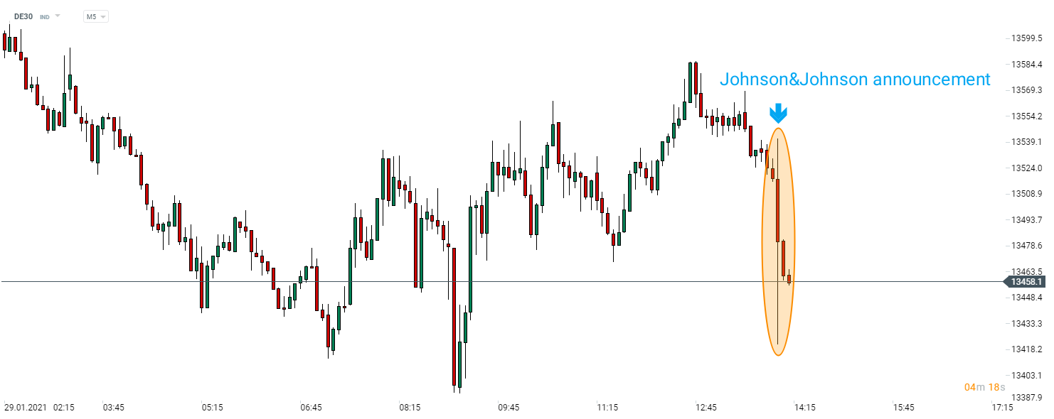 DE30 a scăzut în jur de 1% în urma rezultatelor dezamăgitoare ale studiilor privind vaccinul pentru coronavirus al Johnson & Johnson. Sursa: xStation5