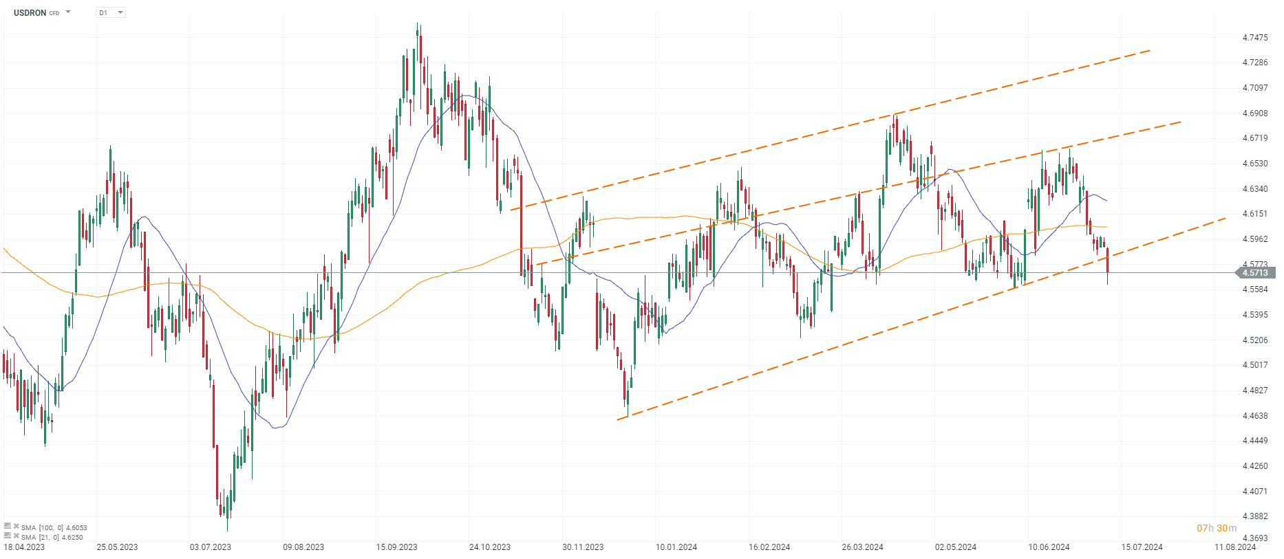 După publicarea datelor CPI, sesiunea de joi a adus o slăbiciune a dolarului american în raport cu leul, cursul atingând cel mai scăzut nivel de peste o lună (4 iunie). Mișcarea a fost alimentată de o slăbiciune generală a dolarului american, care a fost surprins de o inflație CPI mai scăzută decât se prognoza în luna iunie. Sursa: xStation 5
